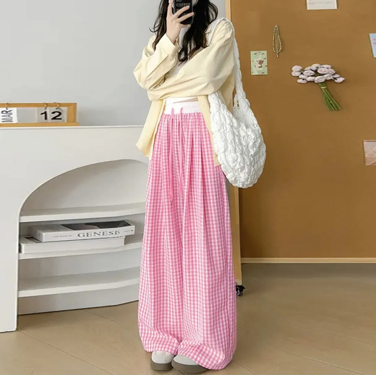 (🌍 PRODUCTO INTERNACIONAL) Pantalones Anchos Cuadros Mujer Rosas Casuales Mx