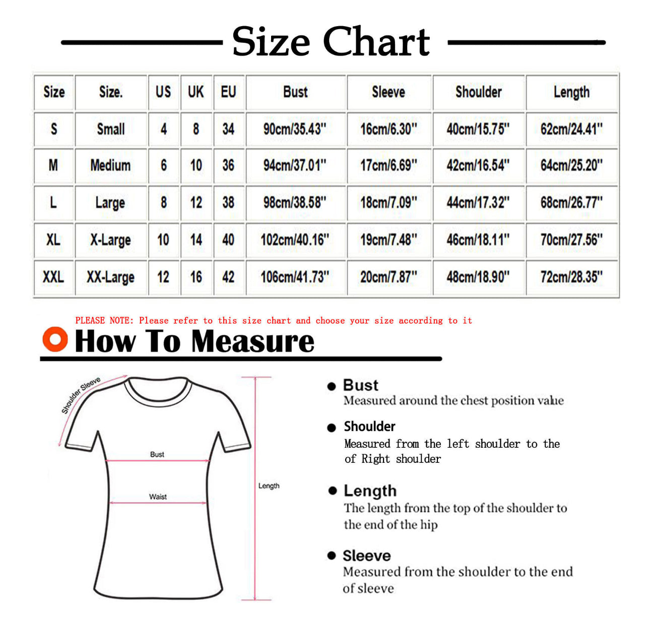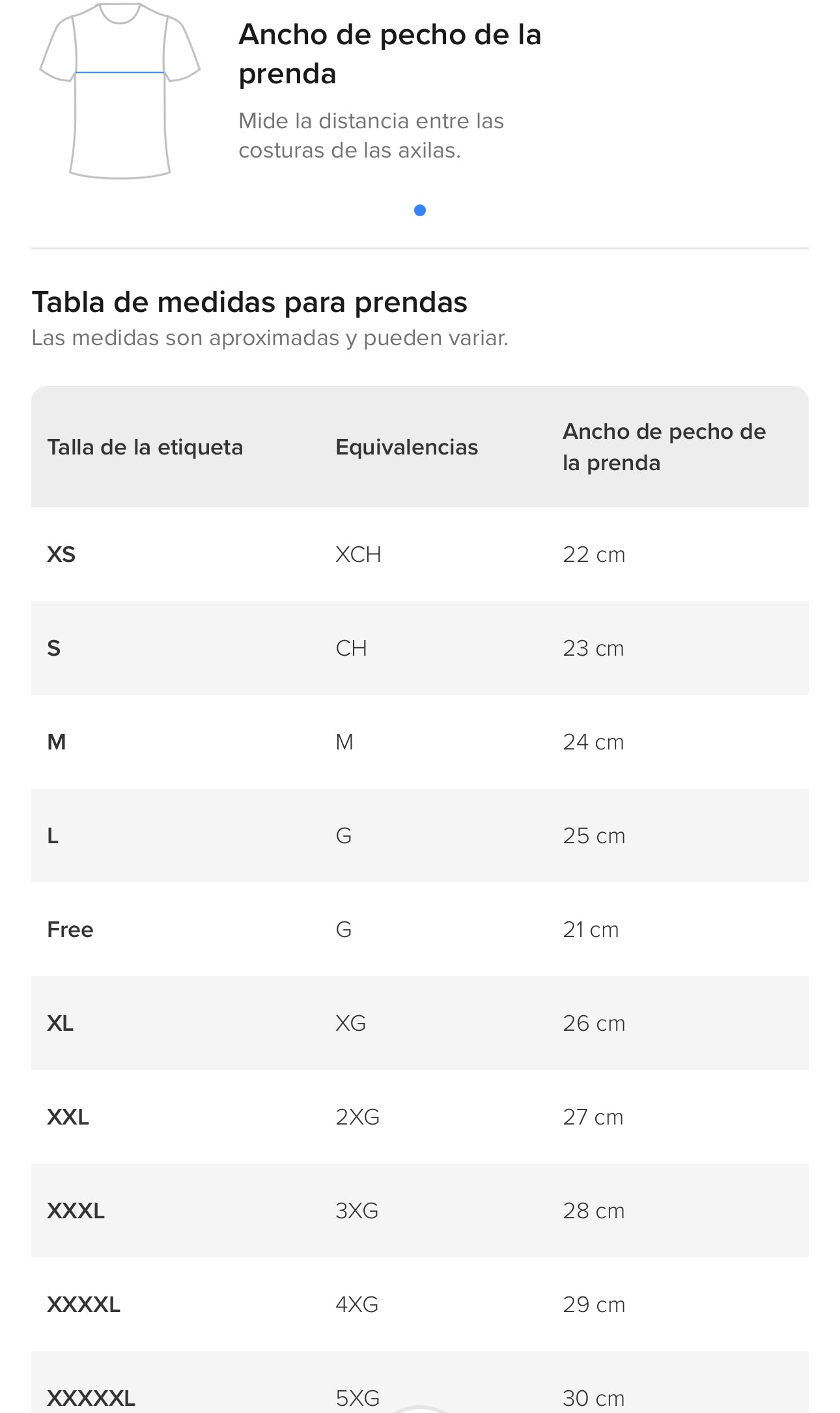 XL Busto: 102 cm/40,16 pulgadas, manga: 19 cm, 7,48 pulgadas, hombro: 46 cm/18,11 pulgadas, longitud: 70 cm/27,56 pulgadas, talla XXL. Busto XXL: 106 cm/41,73 pulgadas, manga: 20 cm/7,87 pulgadas, hombro: 48 cm/ 18,90 pulgadas, longitud: 72 cm/28,35 pulgadas