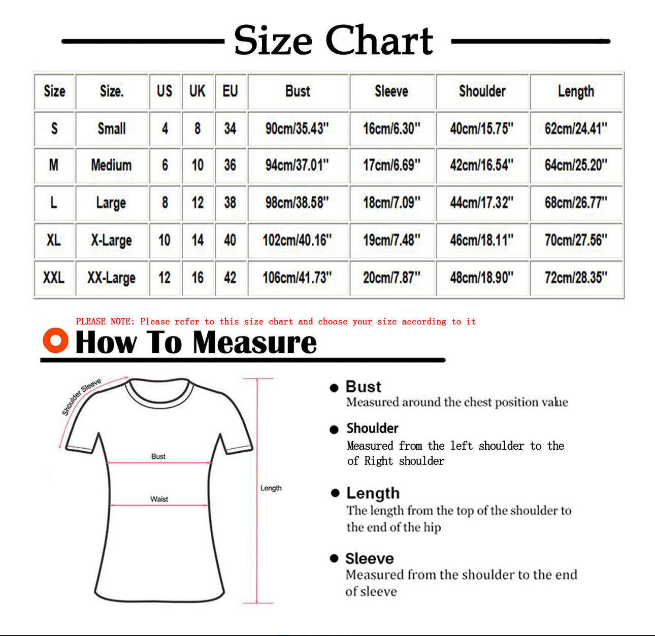 XL Busto: 102 cm/40,16 pulgadas, manga: 19 cm, 7,48 pulgadas, hombro: 46 cm/18,11 pulgadas, longitud: 70
