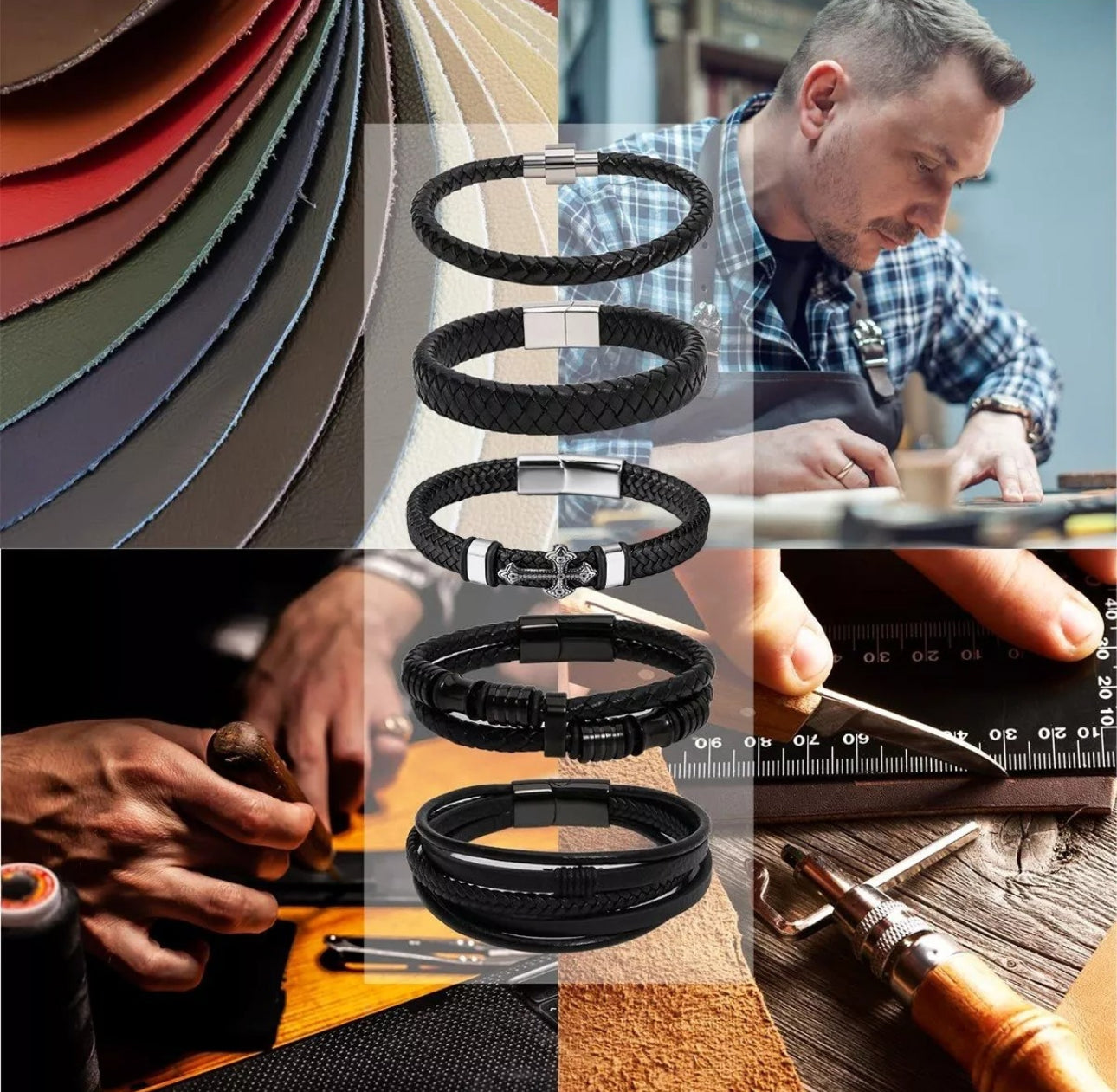 Juego de pulseras de cuero para hombre: el juego de pulseras para hombre contiene 5 pulseras de cuero trenzado de diferentes estilos: 1 pulsera de cuero de doble fila, 1 pulsera de cuero multicapa, 3 pulseras de cuero negro. Lleno de personalidad y aspecto fresco para mostrar tu masculinidad y encanto.