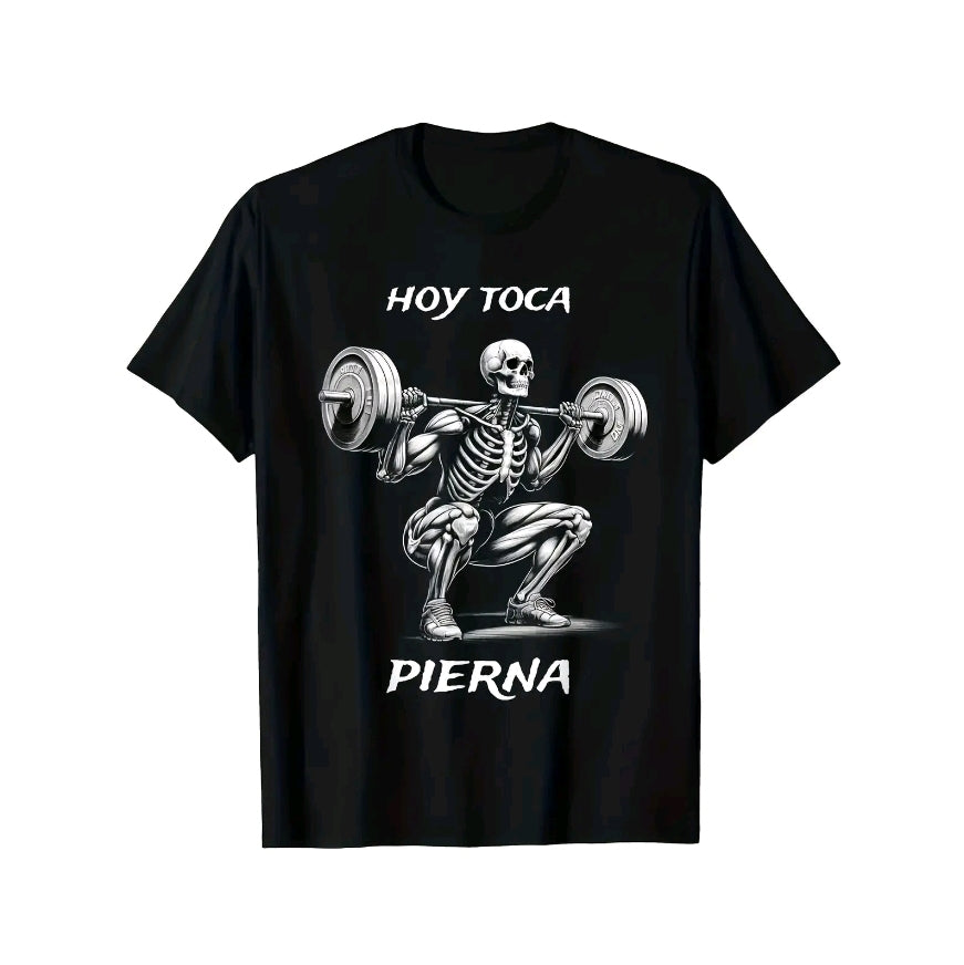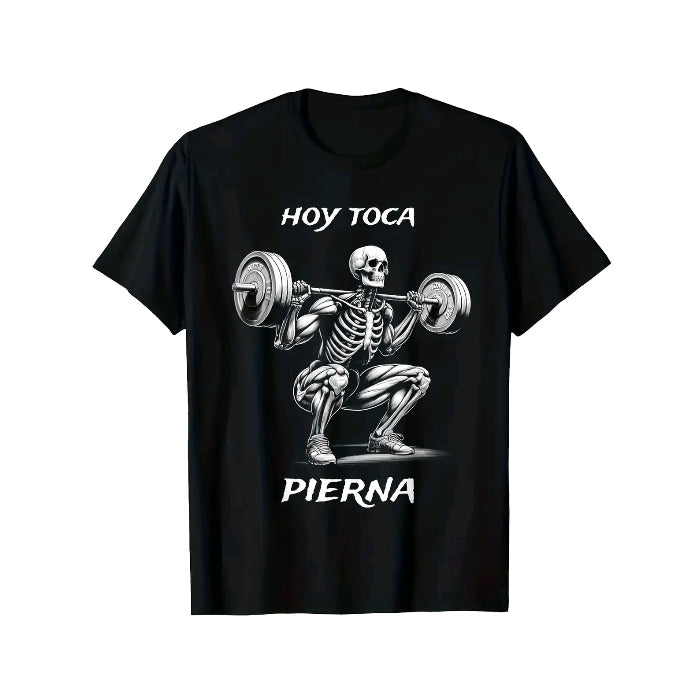 Presentamos nuestra camiseta exclusiva con un diseño audaz de un esqueleto realizando una sentadilla profunda con barra, demostrando que no hay excusas para saltarse la rutina, ¡ni siquiera la falta de carne! El texto en la parte superior e inferior dice la frase épica que todo gym rat conoce: "HOY TOCA PIERNA".