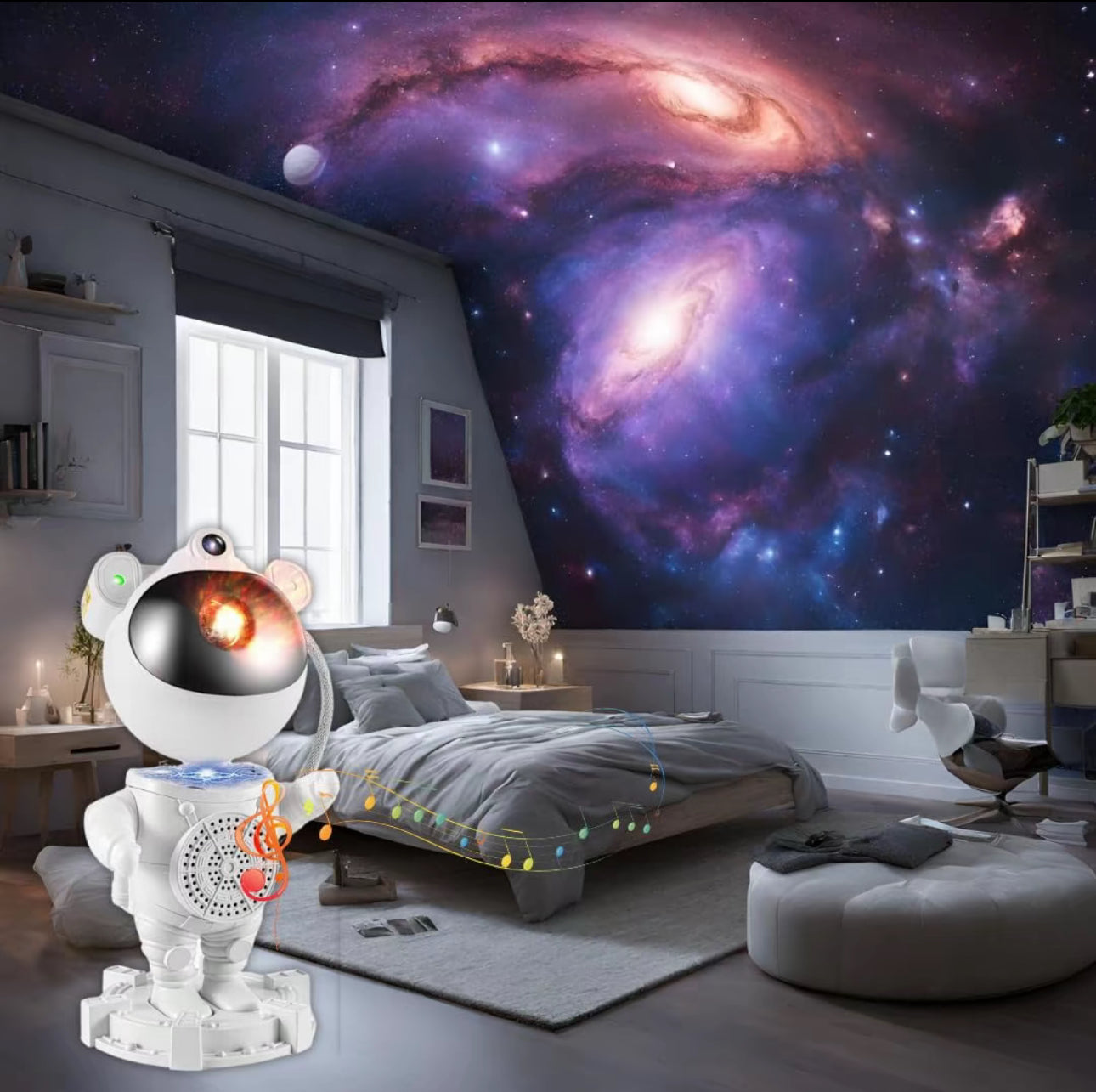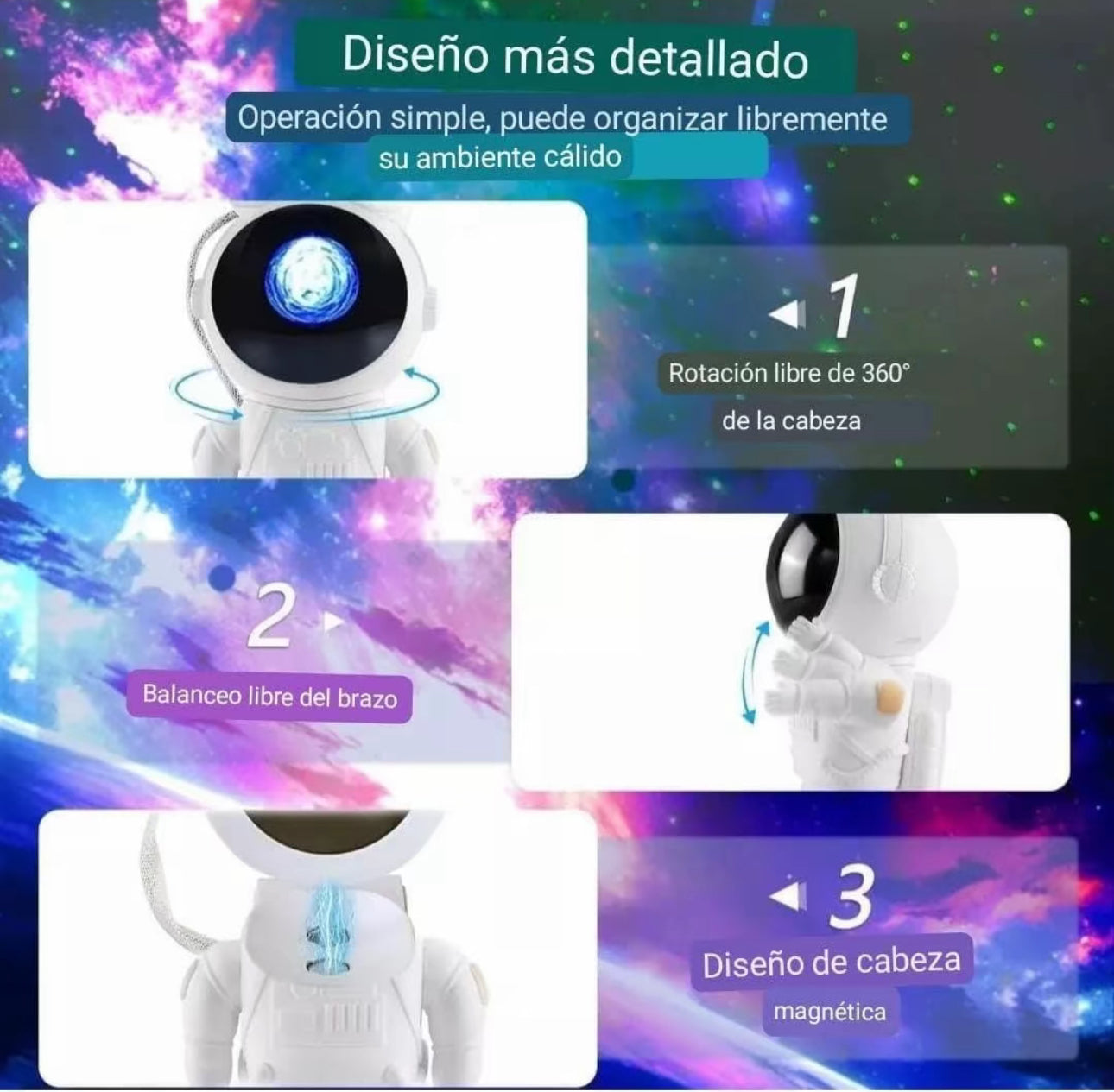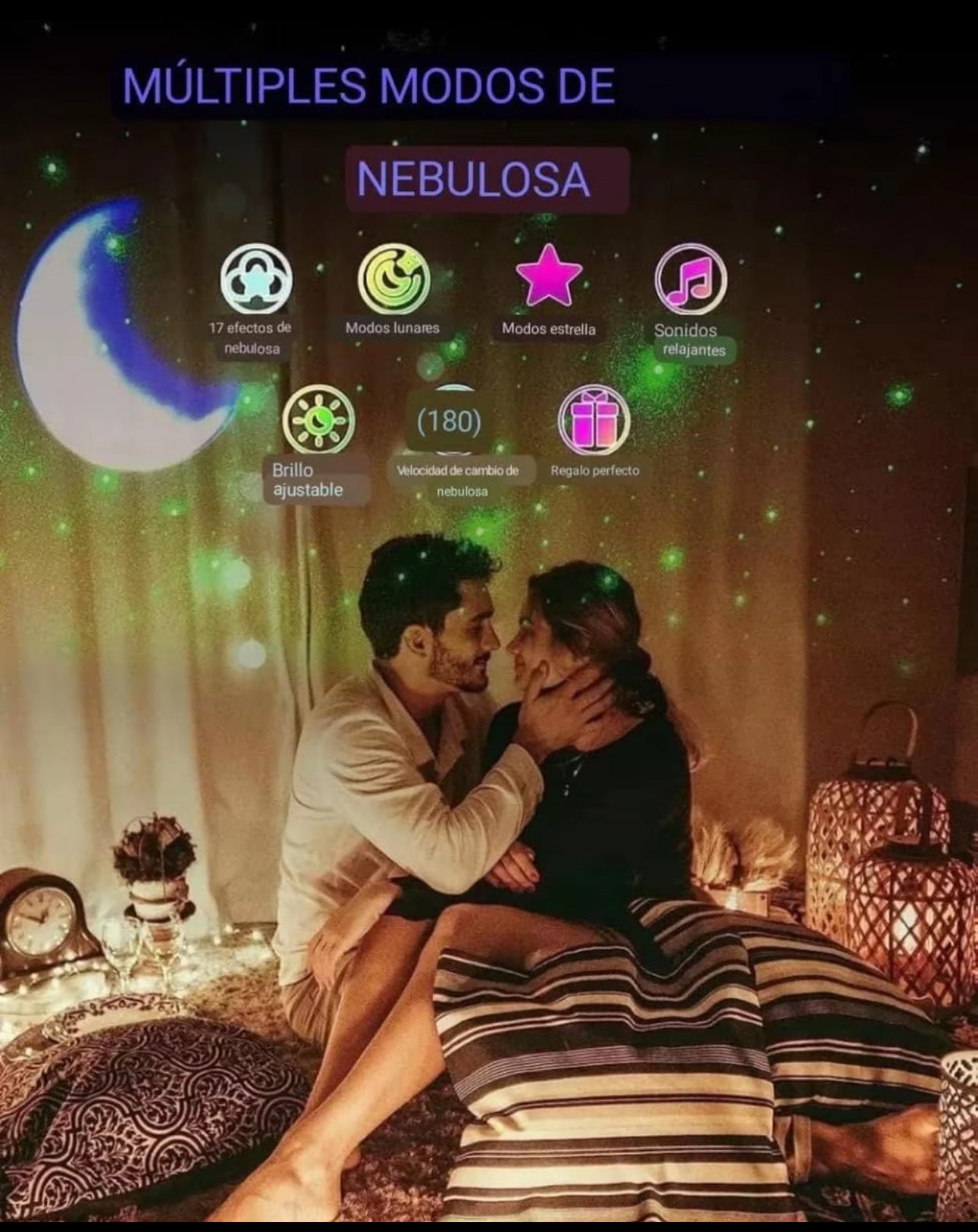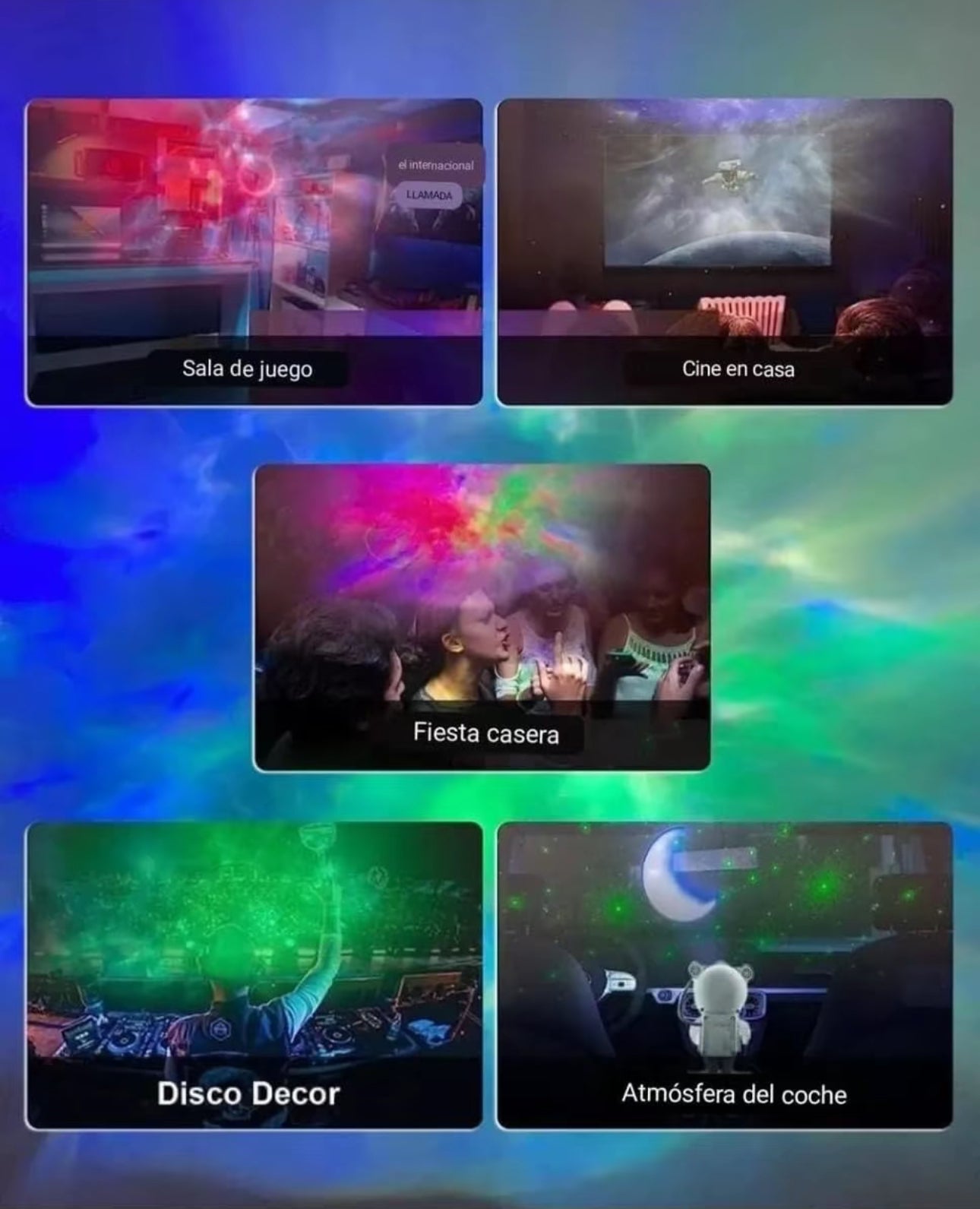 - Nebulosa Astronauta, acompañados de estrellas verdes titilantes. Proyéctalo en las paredes o el techo de tu habitación para llevar la luz de la galaxia a tu espacio, creando un ambiente sereno y relajante. Iluminación ambiental perfecta para noches de cine, noches de cita o configuraciones de juegos.
