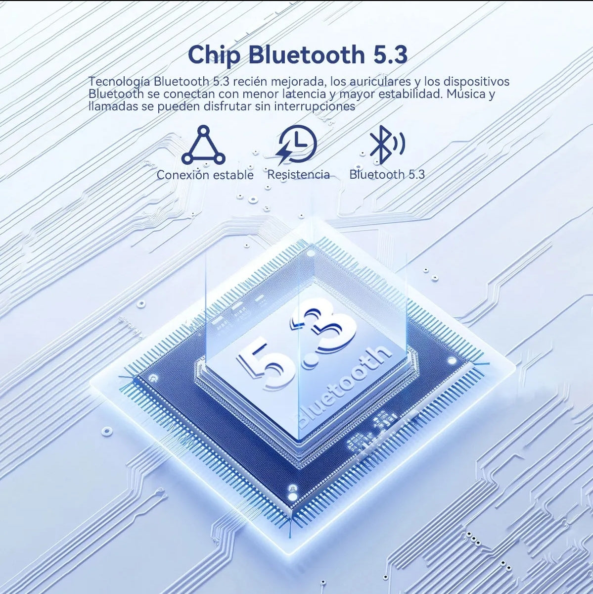 """Version 5.3"" Chip 5.3 es cómodo de Llevar y totalmente compatible Toma e! control de la situaclór rápidamenteEquipados con la nueva generación de chip 5.3 de baja latencia, 30 ms de latencia para jugar rapidíisimo, el modo de juego se ayuda a superar al rey