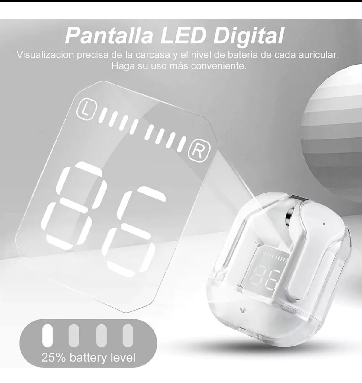 'Canal auditivo separado, indicador LED del nivel de batería"* Conmutación aleatoria mono y binaural, lo que permite escuchar en ambos auriculares de forma independiente con sonido estéreo. Pantalla digital para visualizar el nivel de baterfa en la caja y en el móvil,