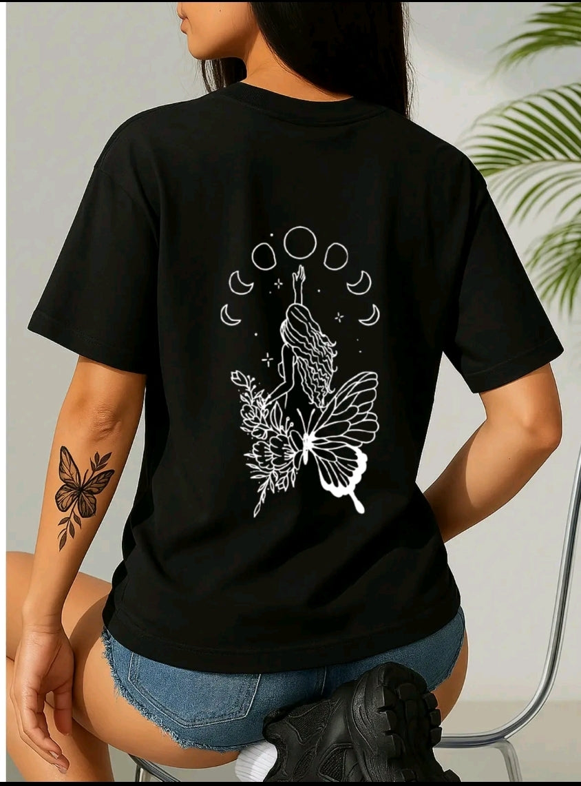 Dale un giro a tu estilo con esta camiseta de diseño único. El estampado en la espalda de la mujer, la mariposa y la luna es un punto de atención que te hará destacar. Es una prenda versátil que puedes combinar con jeans, shorts o faldas para un look casual, y su diseño la convierte en una pieza clave para tu guardarropa.