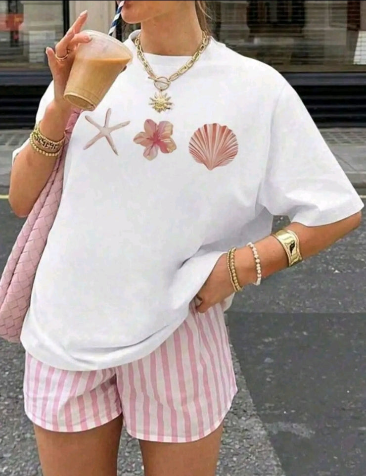 El diseño presenta una alineación de tres elementos costeros en tonos pastel suaves y bronceados: una estrella de mar, una flor tropical (posiblemente un hibisco) y una concha marina (vieira). Los colores suaves contrastan hermosamente con la base blanca oversize, y el look se complementa con accesorios dorados y pantalones de rayas de verano.