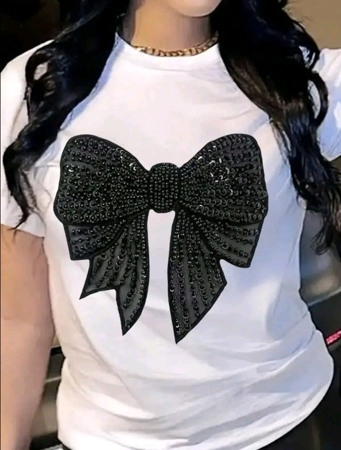 Camiseta Casual para Mujer con Estampado Elegante de moño negro brilloso - Manga Corta Ajuste Relajado