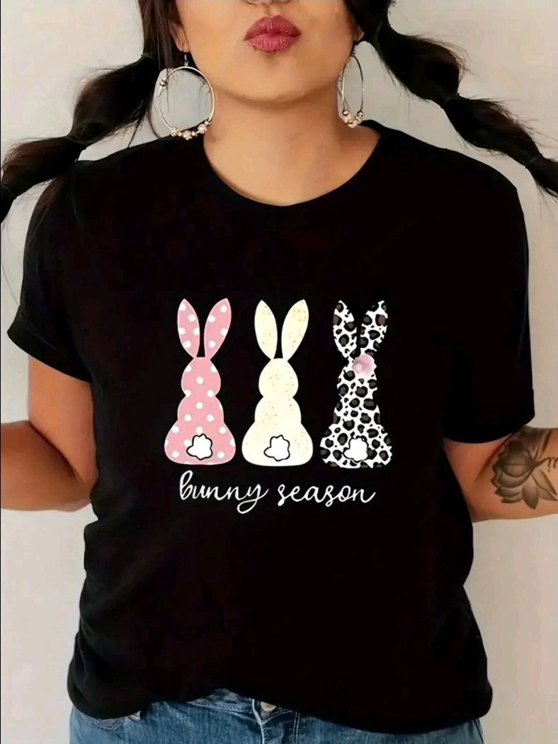 Camiseta De Cuell Redondo Con Estampado De Conejo, Top De Manga Corta Casual Para Primavera verano, Ropa De Mujer