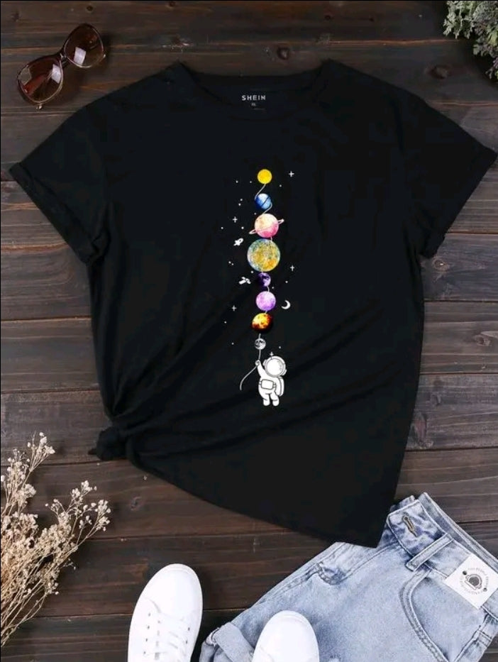 La camiseta negra presenta un adorable estampado de un astronauta flotando que, en lugar de sujetar globos, sostiene la cuerda de un racimo vertical de planetas vibrantes y coloridos del sistema solar. Es una ilustración que combina la belleza de la astronomía con un toque lúdico y artístico.