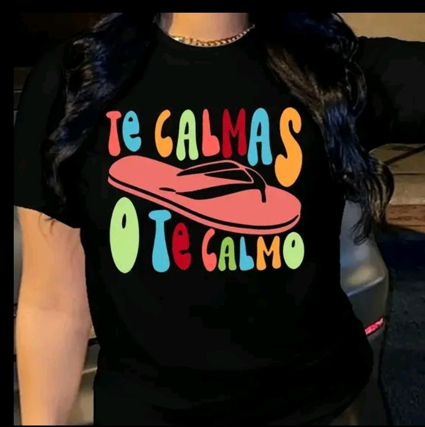 El diseño presenta la frase icónica "Te CALMAS O Te CALMO" en letras coloridas y divertidas, con una chancla o sandalia de playa en el centro. El diseño evoca un sentido de autoridad con un toque cómico, recordándote a la frase clásica de "la chancla voladora" de las madres latinas.