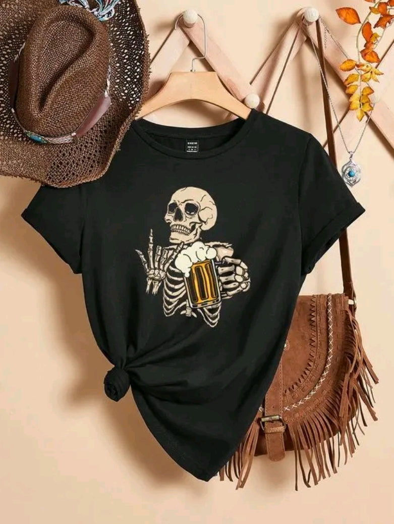 Esta camiseta negra combina un toque de humor macabro con un ambiente totalmente relajado. Perfecta para quienes disfrutan de una buena cerveza y un estilo desenfadado.