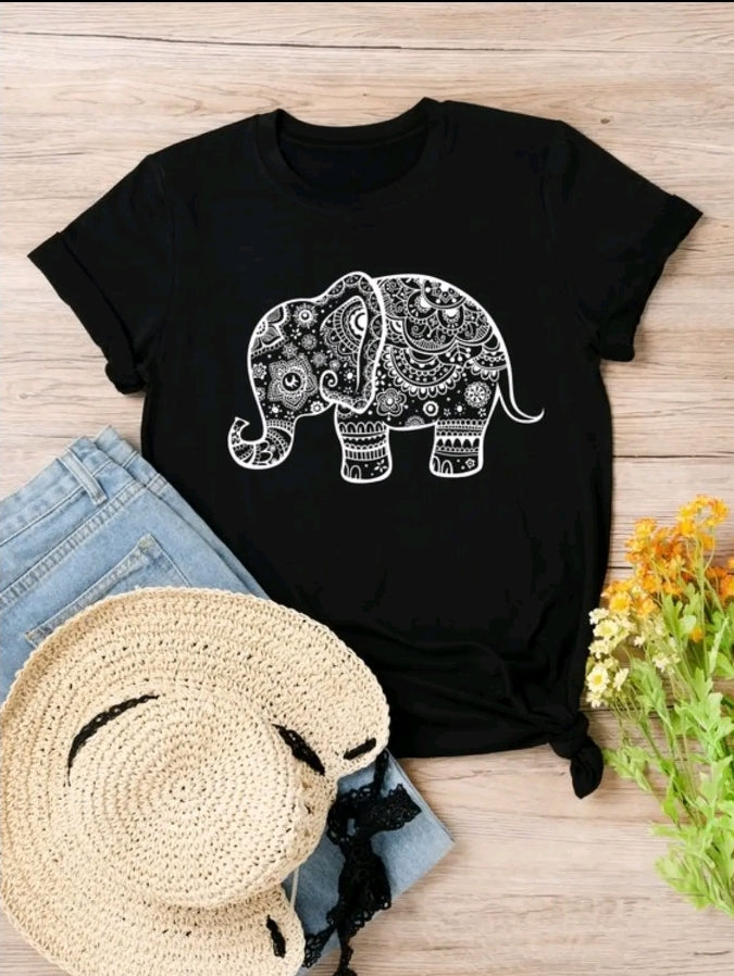 Camiseta De Cuello Redondo Con Estampado De elefante piedra Camiseta De Manga Cort ..