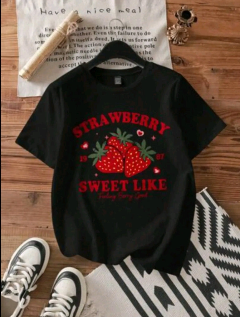 Camiseta De Cuello Redondo Con Estampado De fresas , Camiseta De Manga Corta Casual Para Primavera Y Verano, Ropa De Mujer