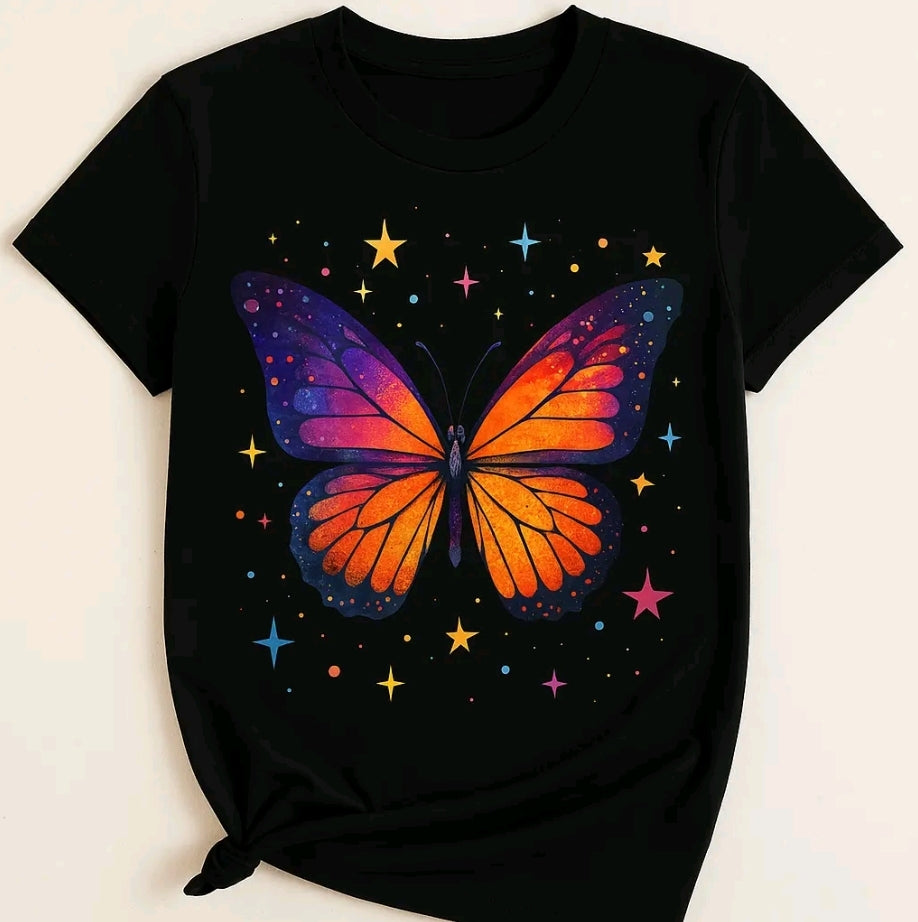 El diseño presenta una mariposa majestuosa con alas que simulan una galaxia, combinando tonalidades intensas de morado, rosa, naranja y amarillo, con detalles que recuerdan nebulosas y constelaciones. Alrededor de la mariposa, pequeñas estrellas de diversos colores brillan sobre el fondo negro, creando un efecto mágico y cósmico.