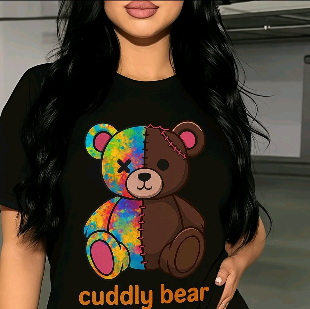 Camiseta De Cuello Redondo Con Estampado De osito colors Camiseta De Manga Corta Casual Para Primavea Y Verano, Ropa De Mujer