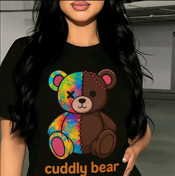 El diseño central es un adorable osito de peluche que está dividido en dos mitades: la izquierda es una explosión de colores psicodélicos, tie-dye o splash art, y la derecha es el clásico osito de peluche cosido con un ojo con forma de "X". Abajo, el texto en naranja dice: "cuddly bear" (Oso Abrazable).