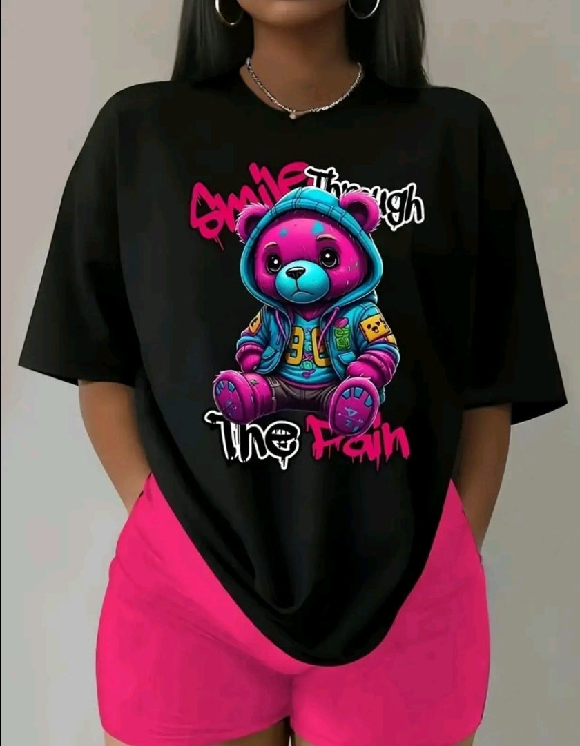 El diseño presenta un oso de peluche de estilo urbano en tonos rosa y morado neón con una sudadera con capucha azul turquesa. El osito tiene un look rudo pero tierno, y el texto en tipografía de graffiti dice: "SMILE THROUGH THE RAIN" (Sonríe a través de la lluvia), un recordatorio de resiliencia con mucho estilo.