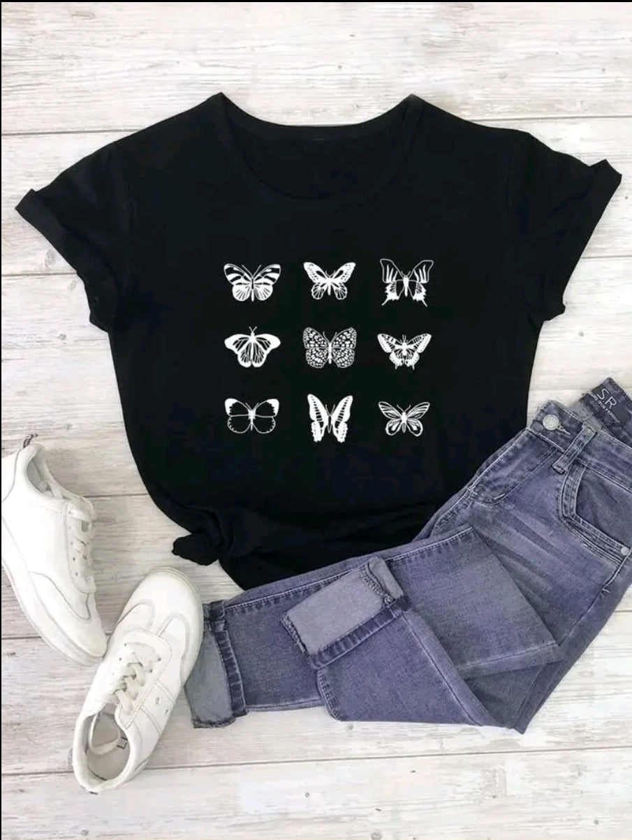 * Detalles del Diseño: Esta camiseta para mujer presenta un patrón de mariposas floridas. El diseño es simple y elegante, ideal para aquellos que buscan una prenda con un toque natural y delicado. Las mariposas son el centro de atención con un toaue natura añadiendo ur aire de frescura v naturaleza a tu outfit