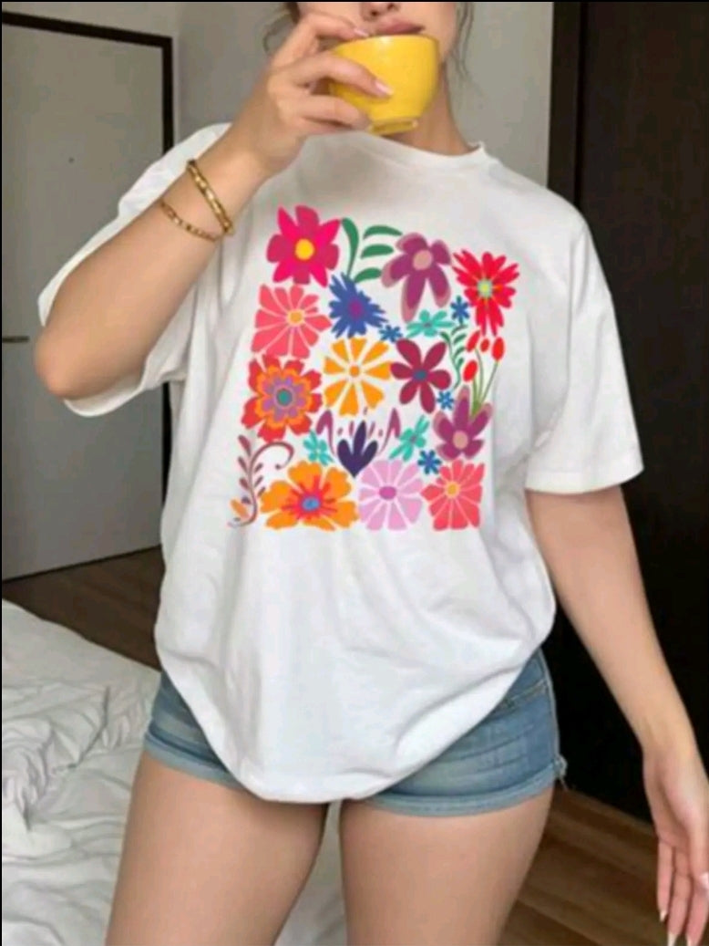 Camiseta estampada con diseño de flores, manga corta cuello redondo, top casual para verano y primavera, ropa de mujer
