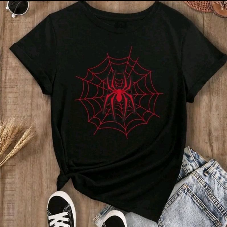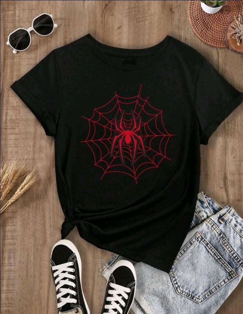 La camiseta presenta un impresionante gráfico central en rojo vibrante sobre un fondo negro sólido: una telaraña perfectamente simétrica y una araña grande y detallada en el centro. El contraste rojo y negro es un clásico instantáneo que evoca un estilo atrevido y vanguardista.