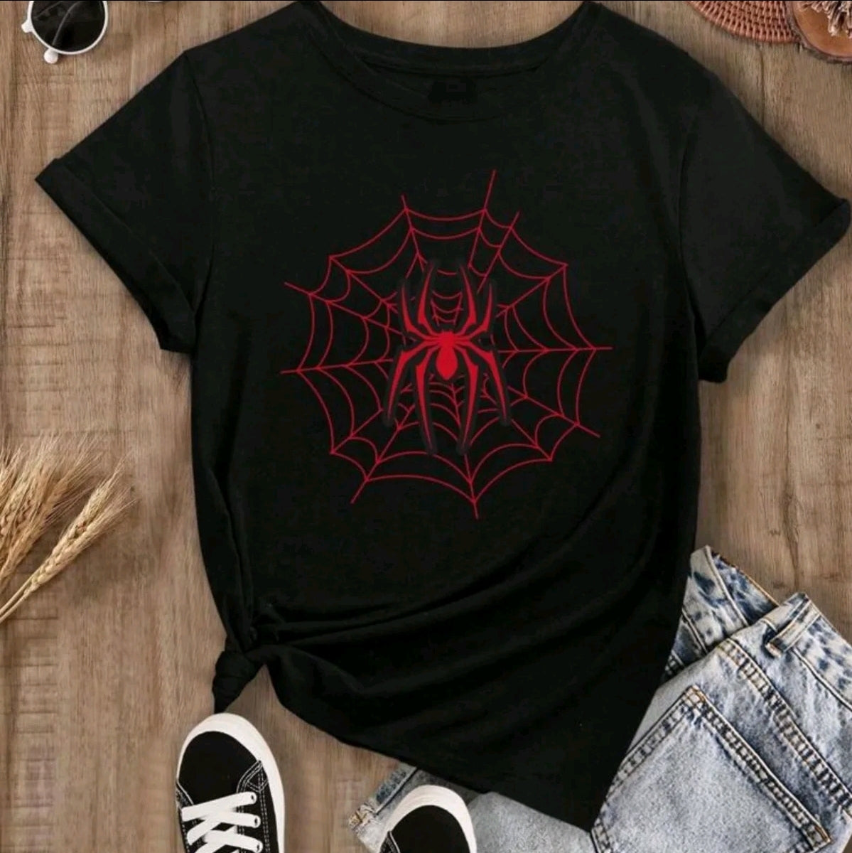 Camiseta Gráfica de araña rojita para Mujer - Camiseta Casual de Poliéster Negra con Detalle de Cremallera, Mangas Cortas y Cuello Redondo, Lavable a Máquina, Ropa CasuallCamiseta Gráfica JuguetonalTop Lavable a Máquina