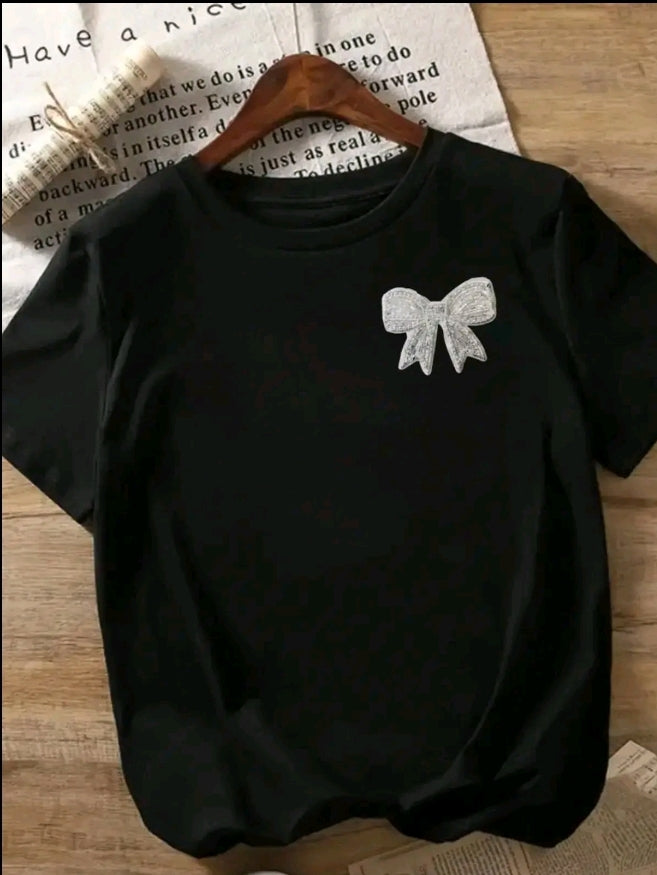 Camiseta gráfica de mariposa casual para mujer - Manga corta, cuello redondo, negro con diseño de Moño , tejido de poliéster suave, perfecta para primavera y verano, ropa casual