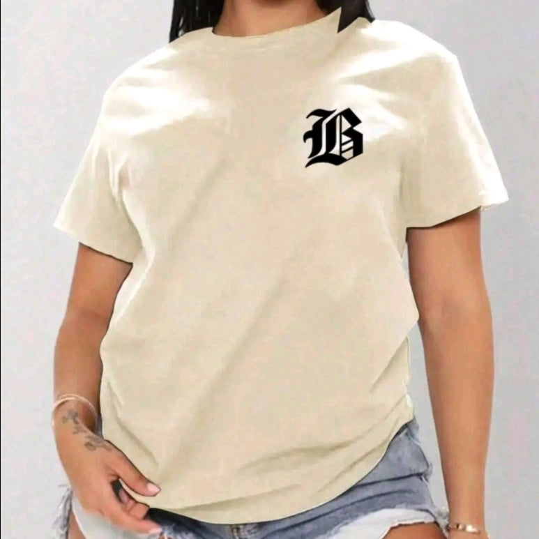 Camiseta Gráfica de Mujer en Rosa Suave con Diseño de Letra B - Cuello Redondo Casual Manga Corta Poliéster Ligero, Perfecto para Atuendos de Primavera V Verano, Ropa de Verano