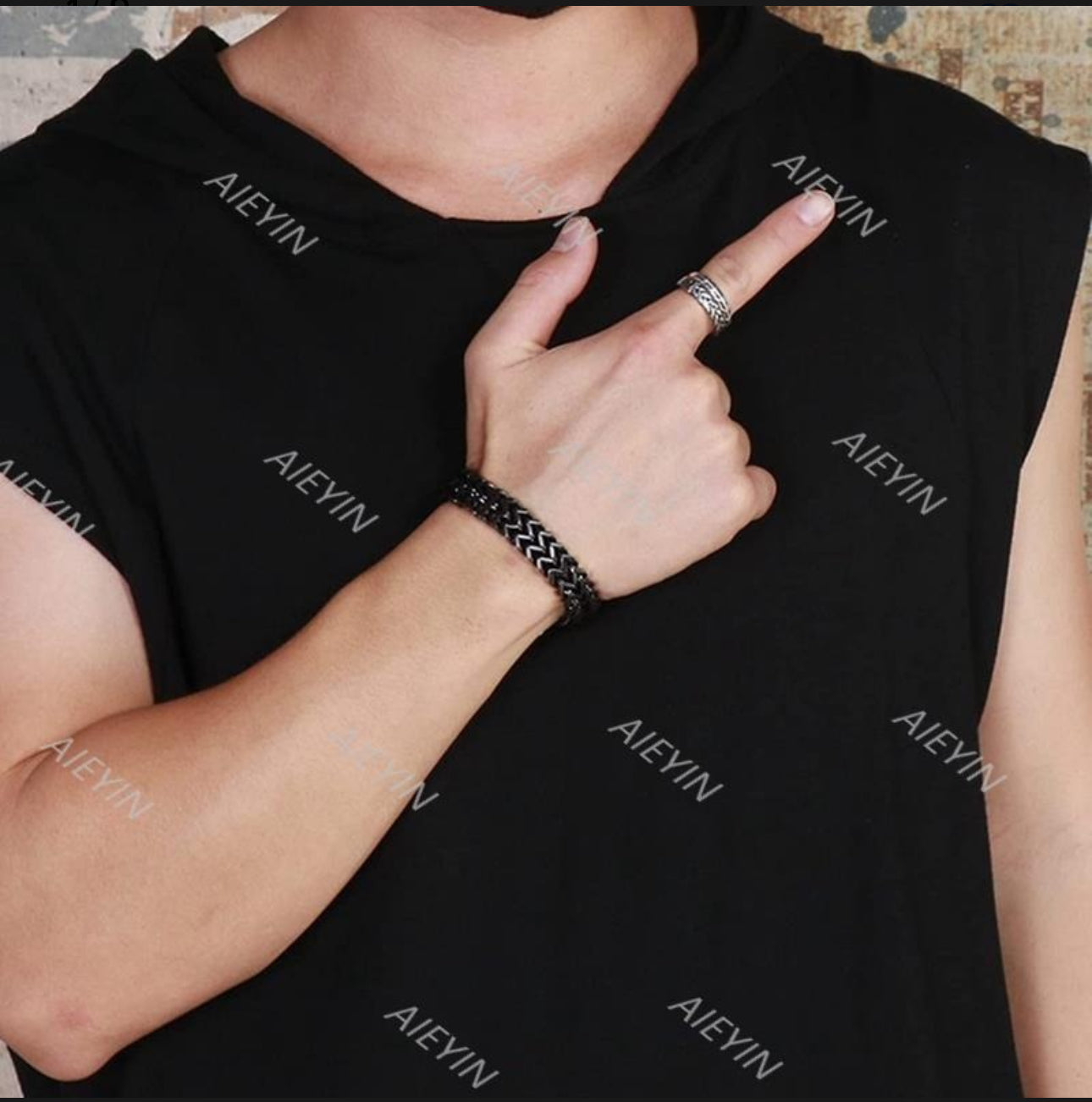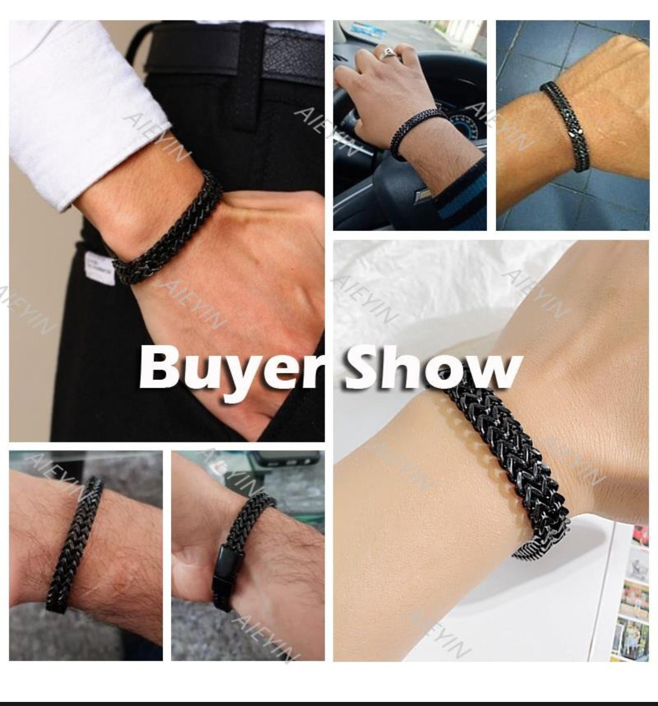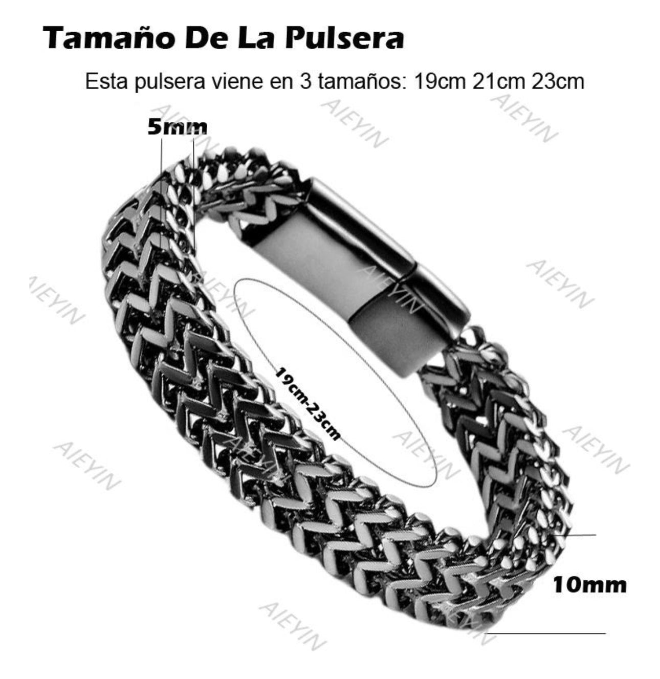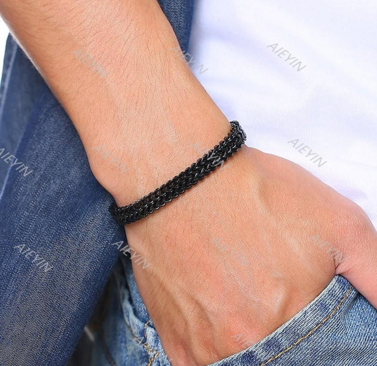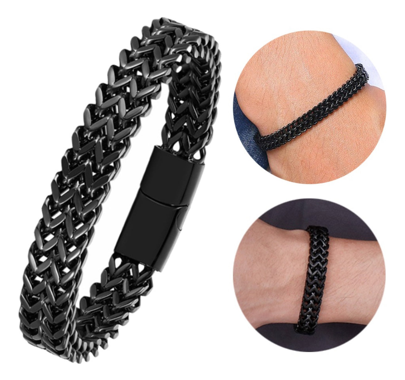 Esta pulsera de hombre es un diseño de cadena cuadrada de doble fila con eslabones de hebilla magnética.