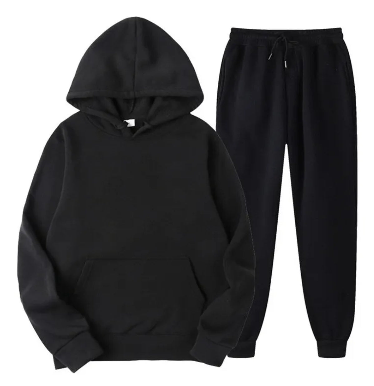 Diseño Versátil: La sudadera con capucha tiene un corte holgado y un bolsillo canguro frontal, y el pantalón de chándal cuenta con cintura elástica y un ajuste cómodo. Ambos son de color negro sólido, lo que los hace increíblemente fáciles de combinar.