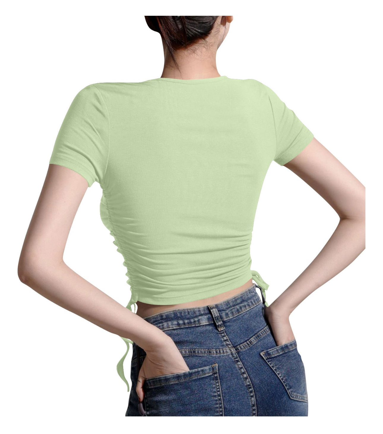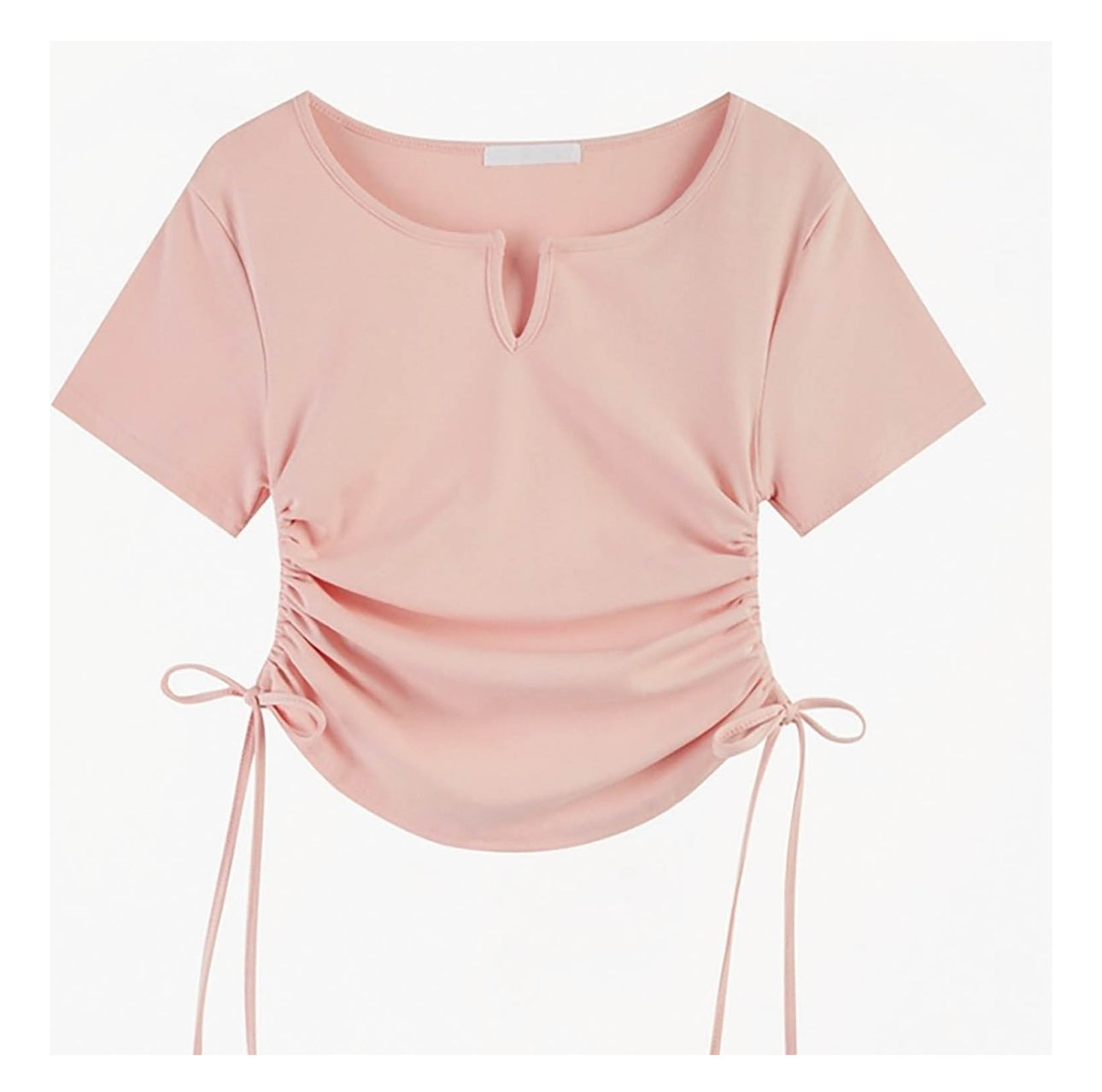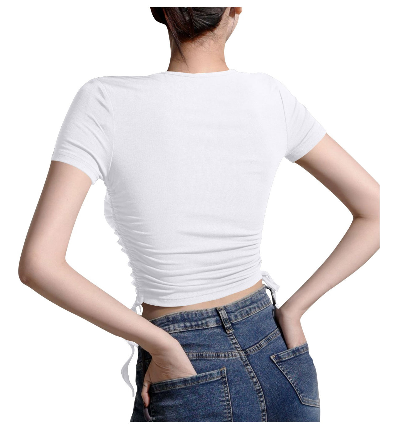 Nueva camiseta casual plisada con cuello en V y manga corta para mujer