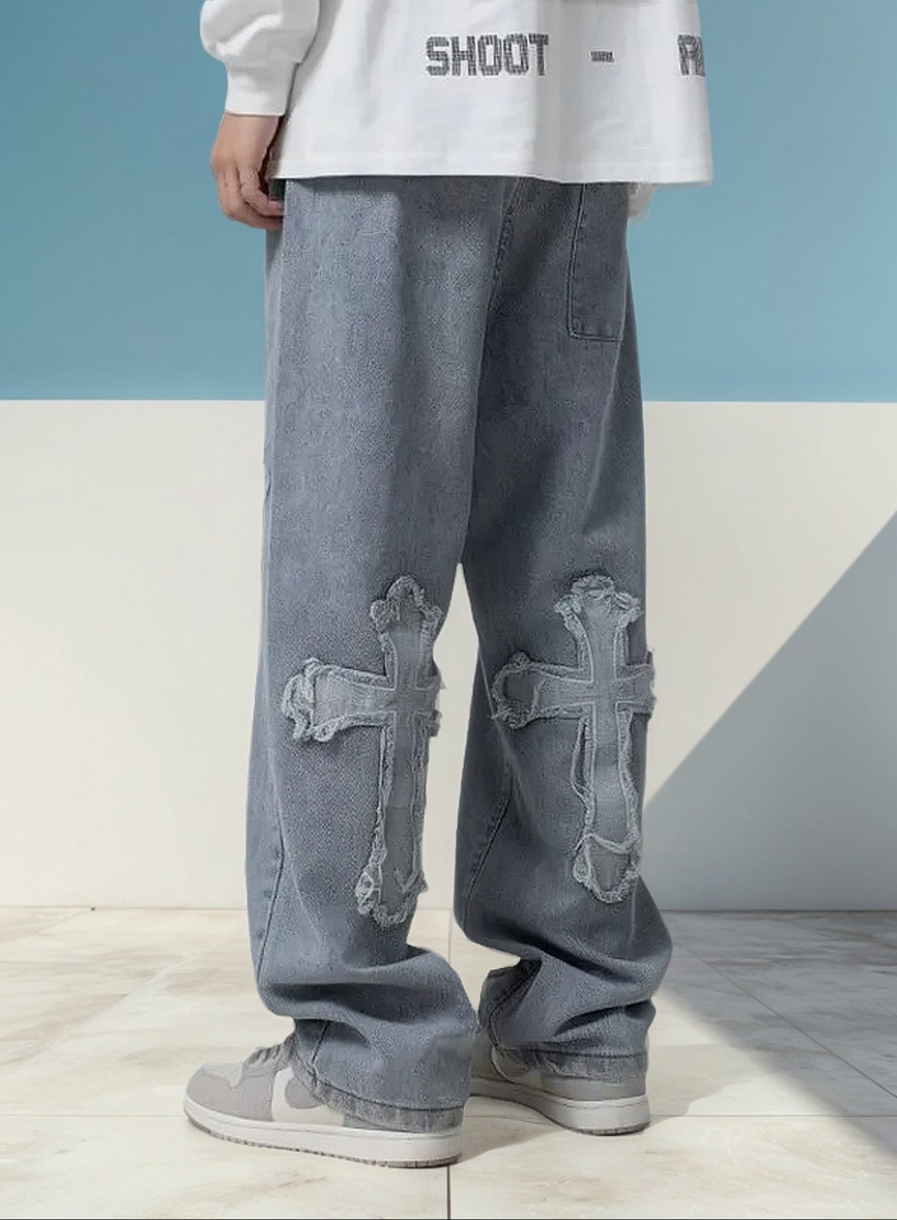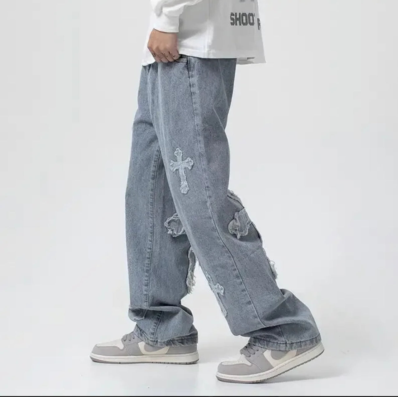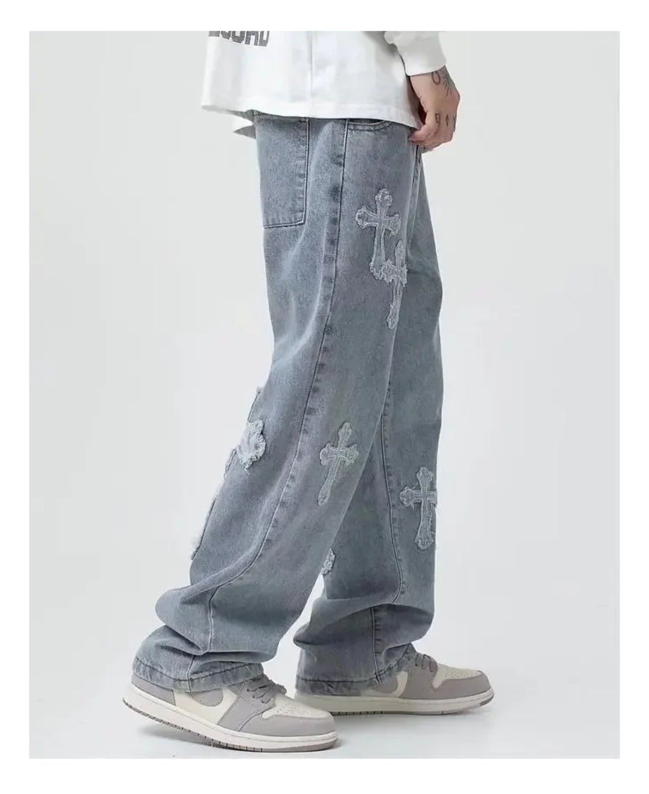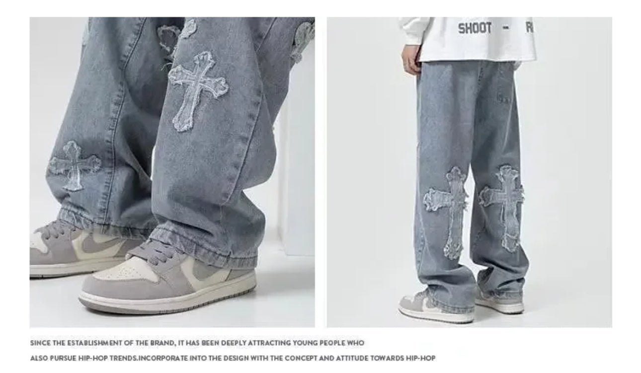 - Diseño: patchwork cruzado, pierna recta y holgada