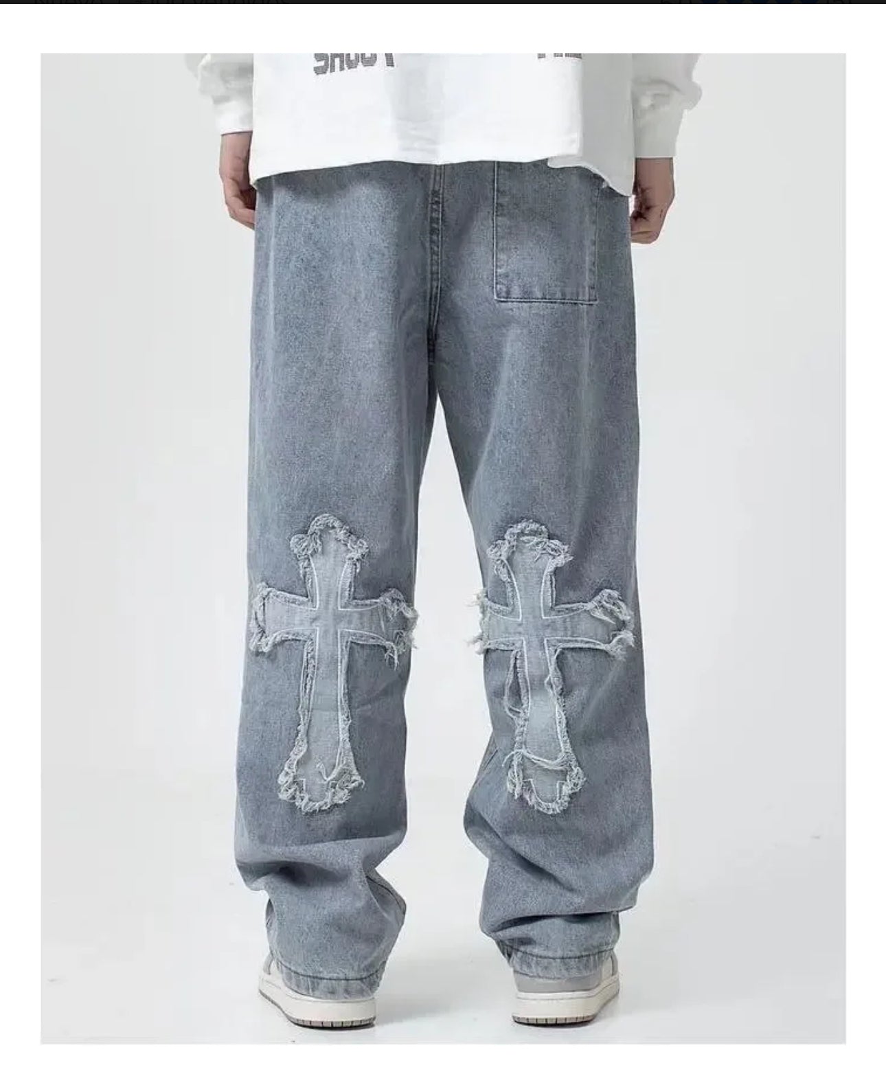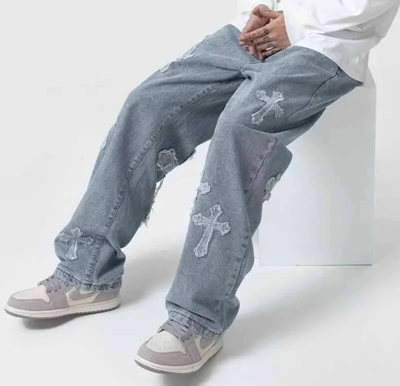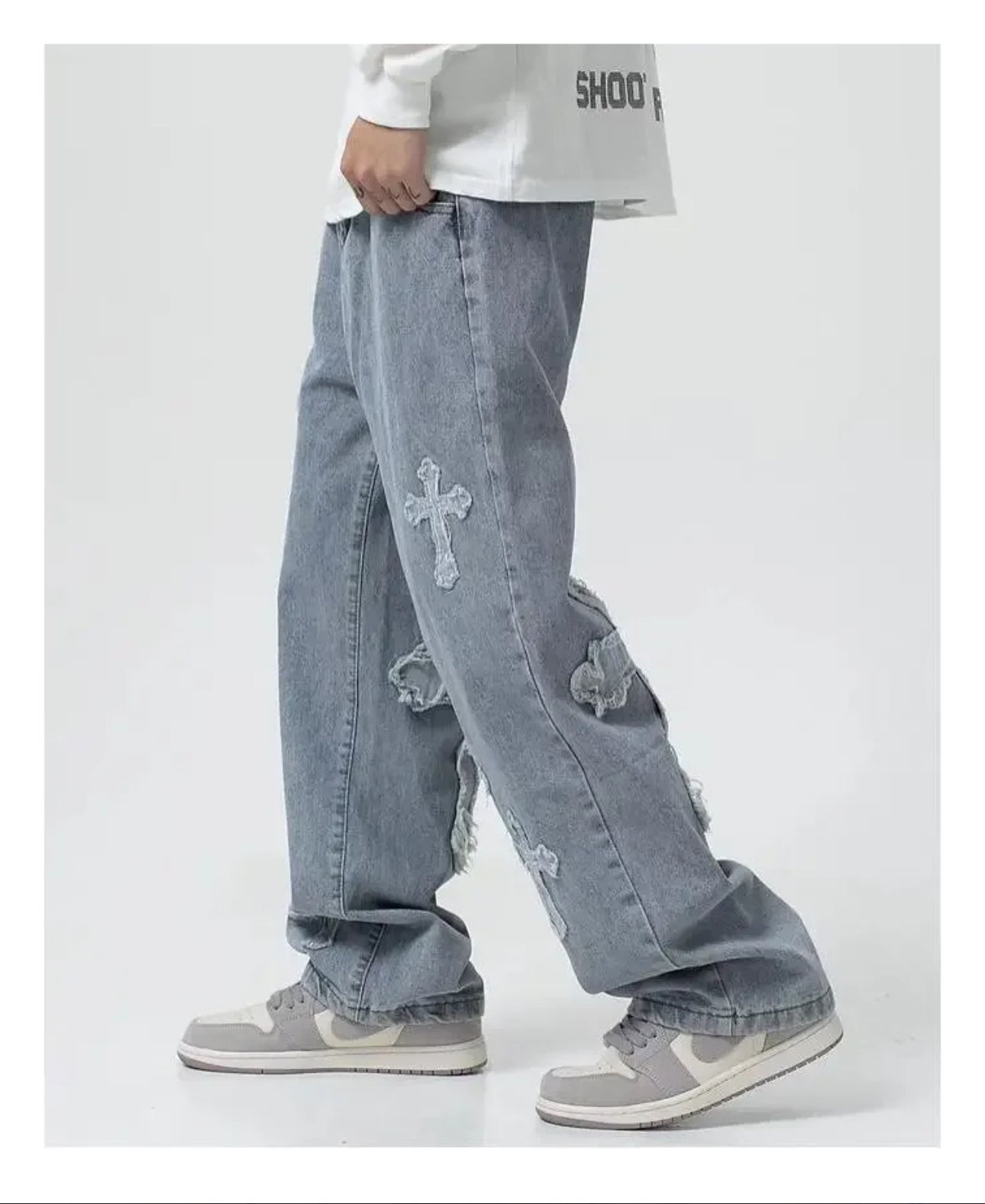 - Diseño: patchwork cruzado, pierna recta y holgada