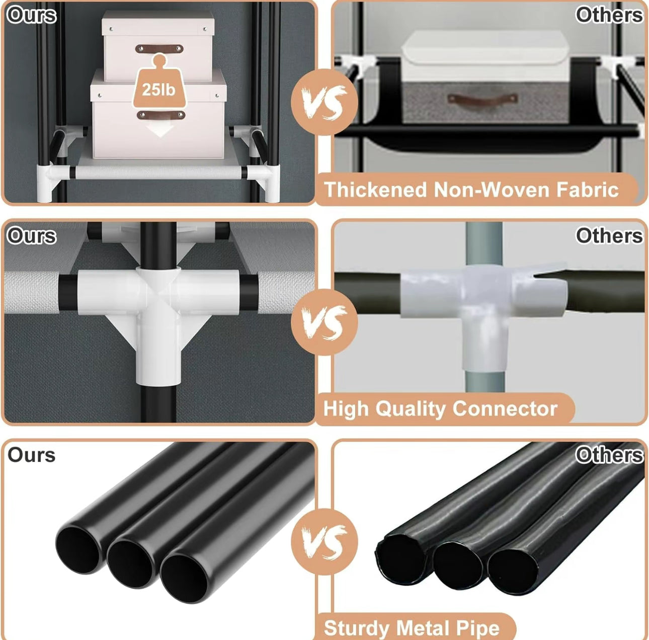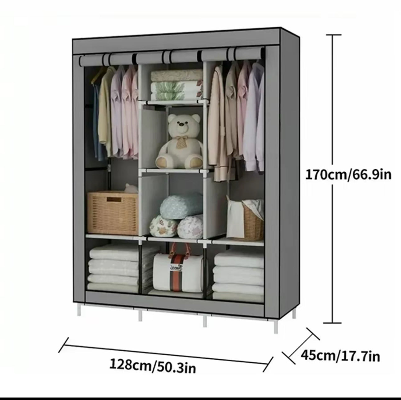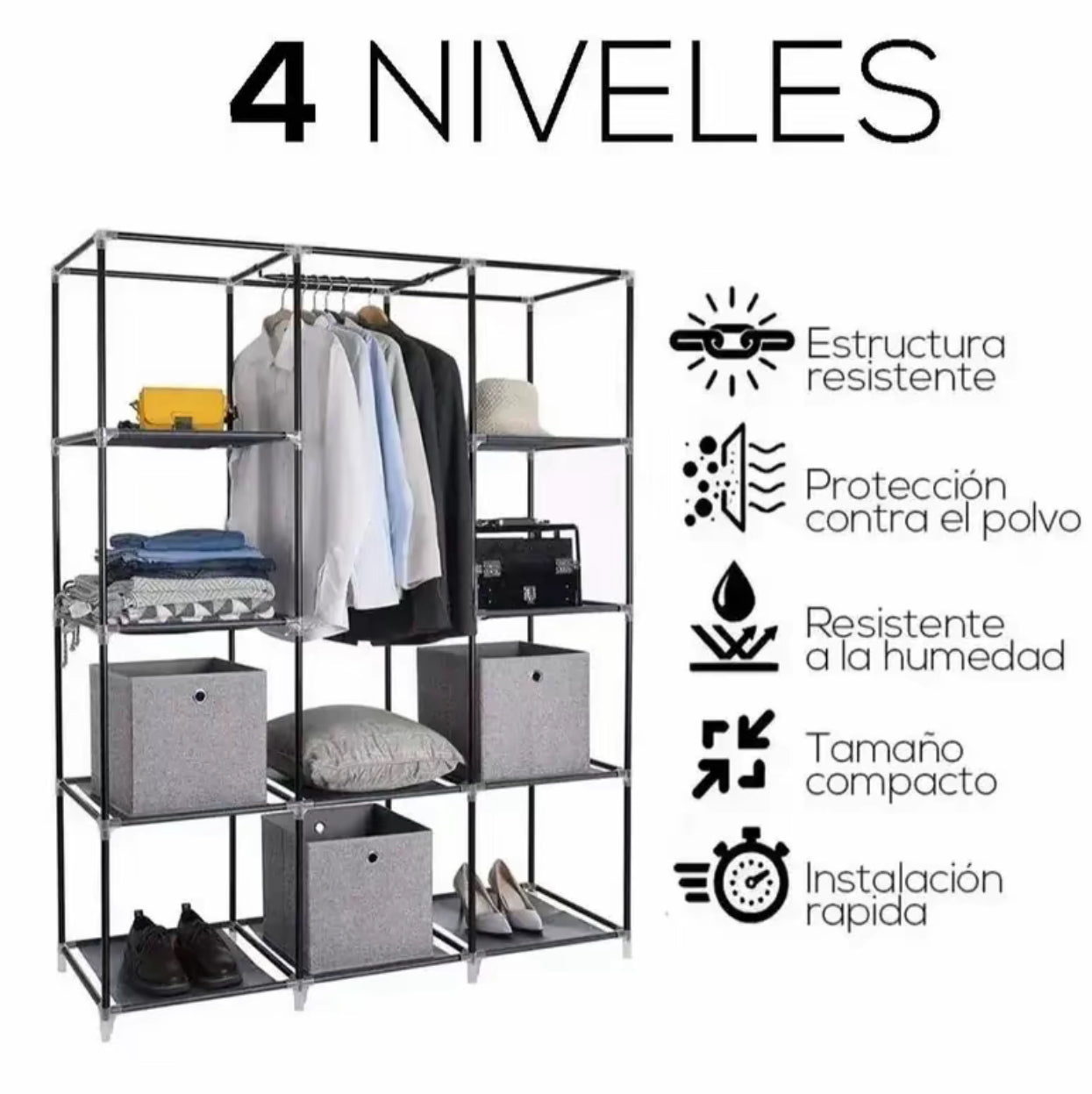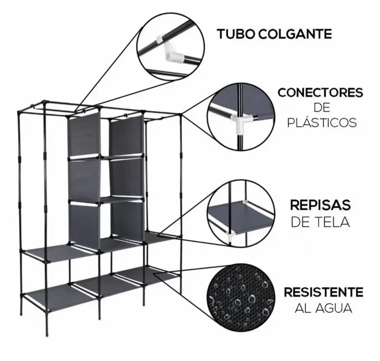 ¡Estructura RESISTENTE! Nuestro closet cuenta con una base de tubos de aluminio, tela ecológica y conectores de plástico; su peso máximo es de 40 kg de peso y su altura es de 175 cm, ideal para colocar todo tu guardarropa en un mismo lugar.