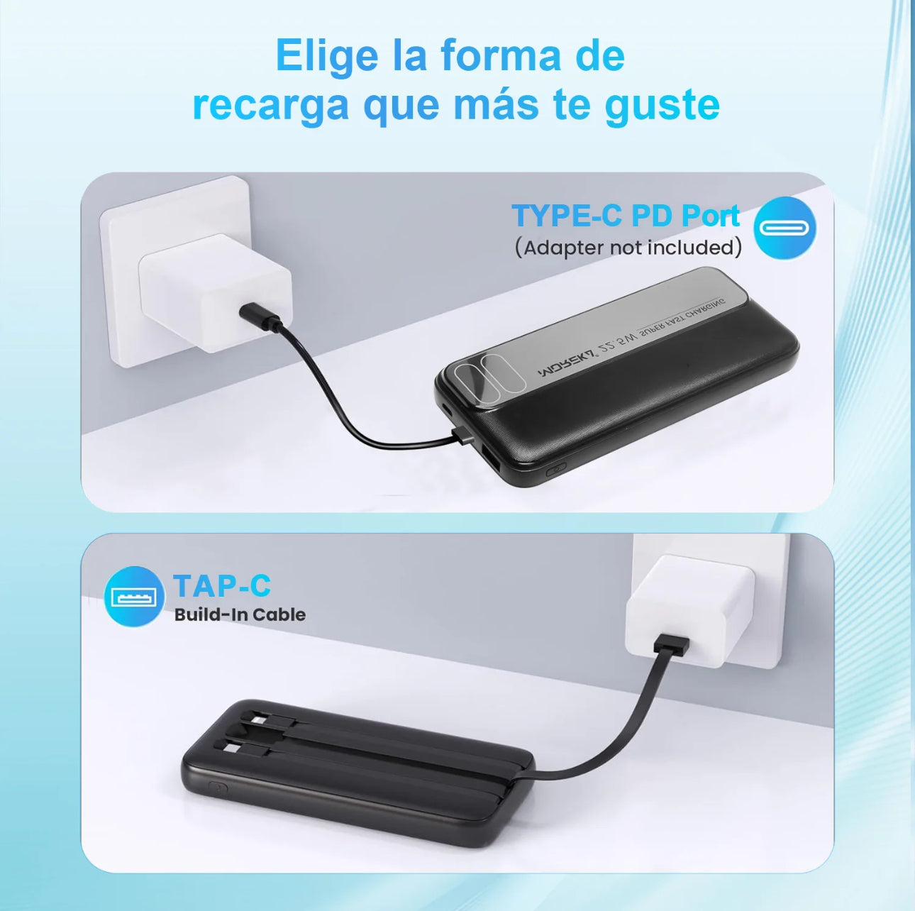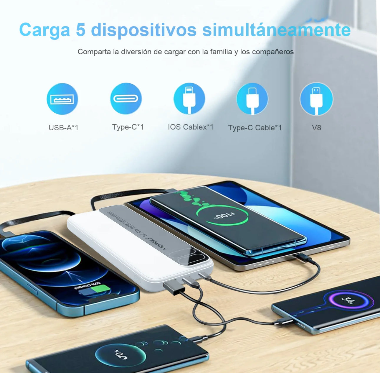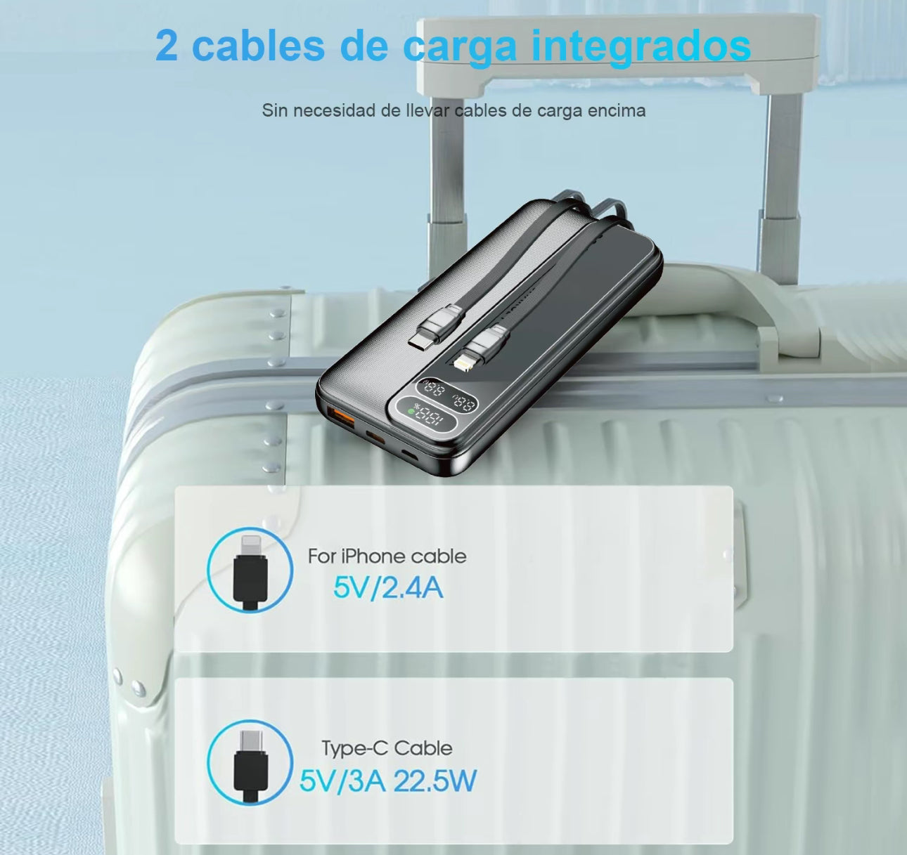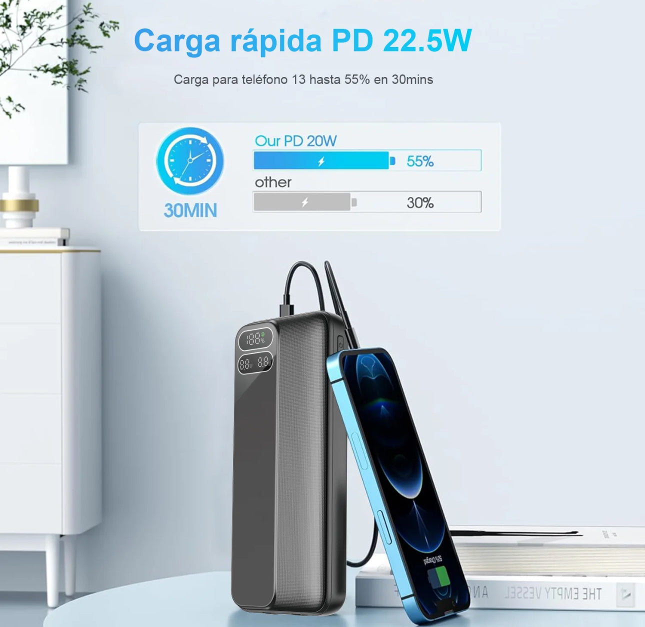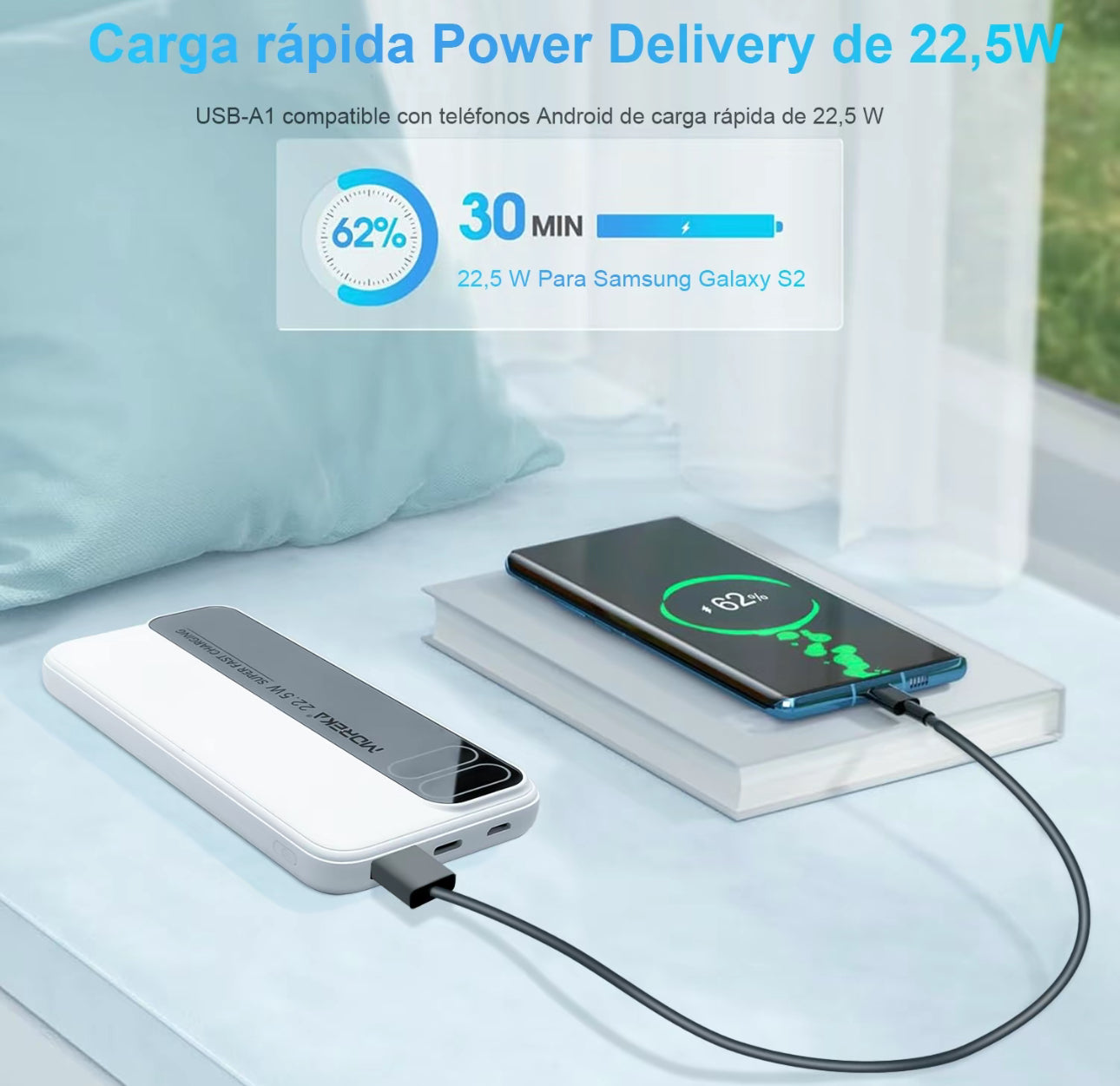 - Cables de 22.5 W y 20 W: el cargador portatil proporciona 22.5 W de potencia de carga inalámbrica.