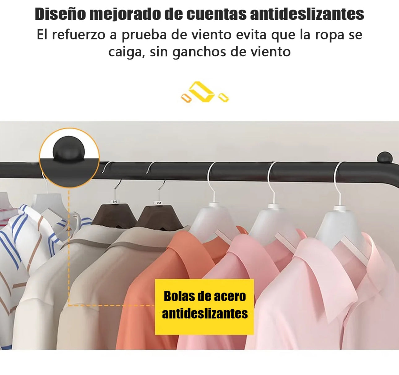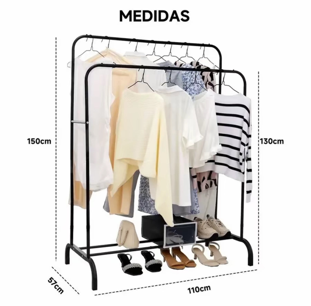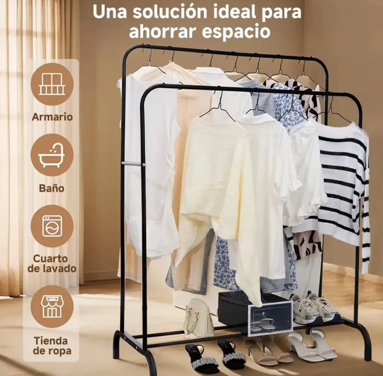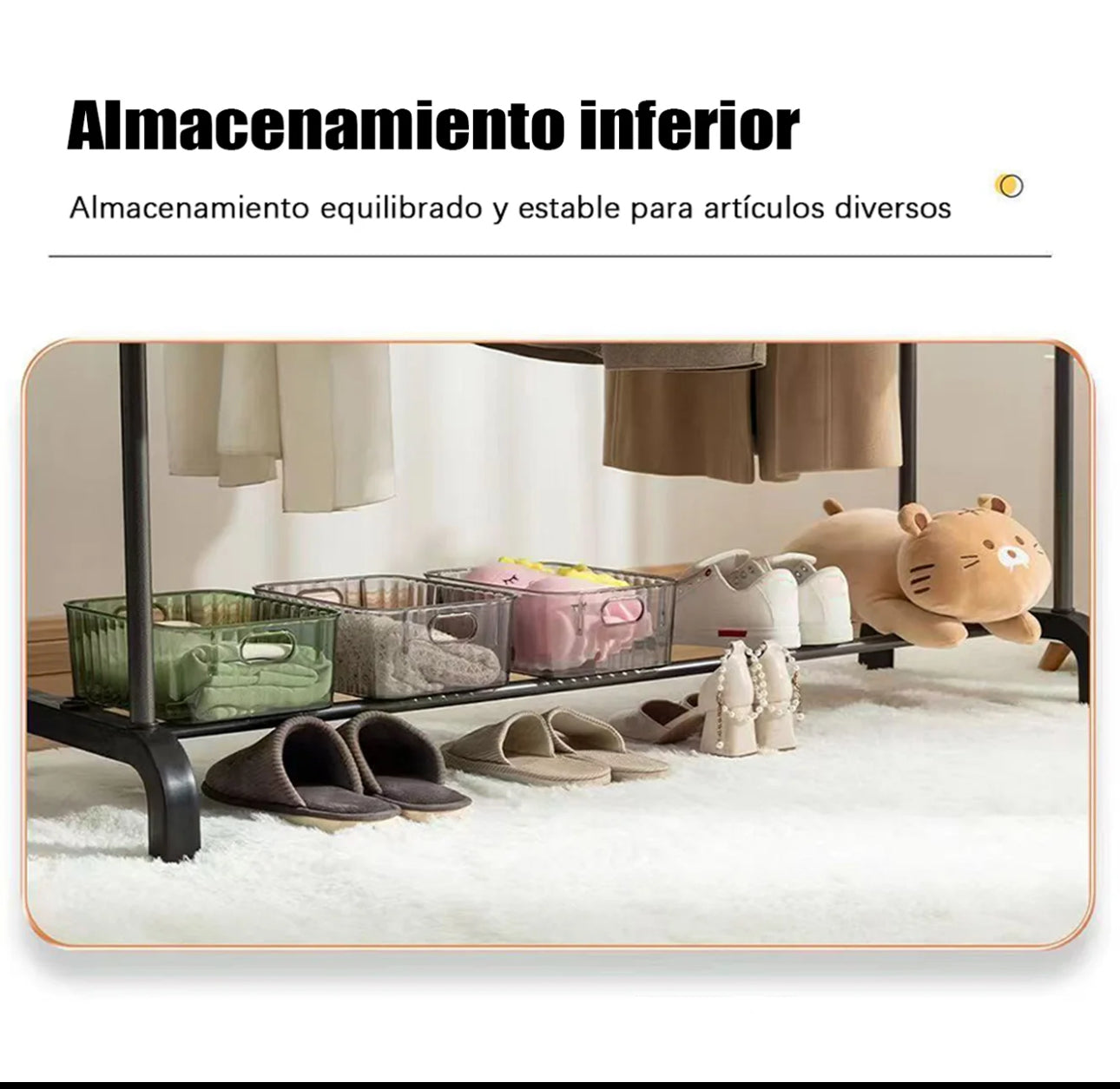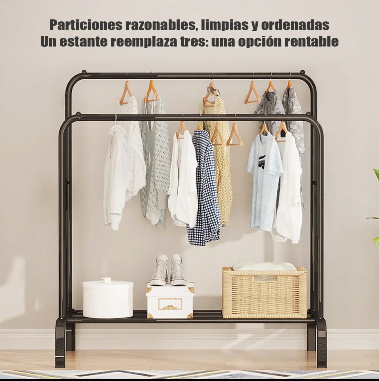 Estructura de doble varilla alta y baja: Cuelga prendas largas (abrigos, faldas) en el estante superior y prendas cortas (camisetas, pantalones) en el inferior para un almacenamiento más ordenado y organizado.