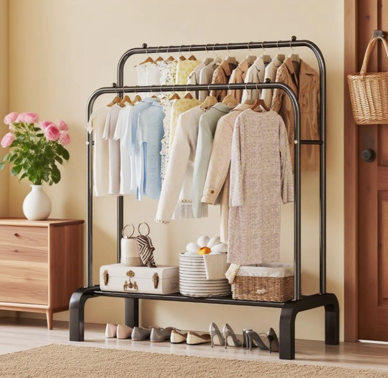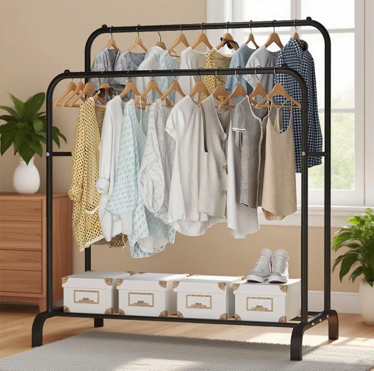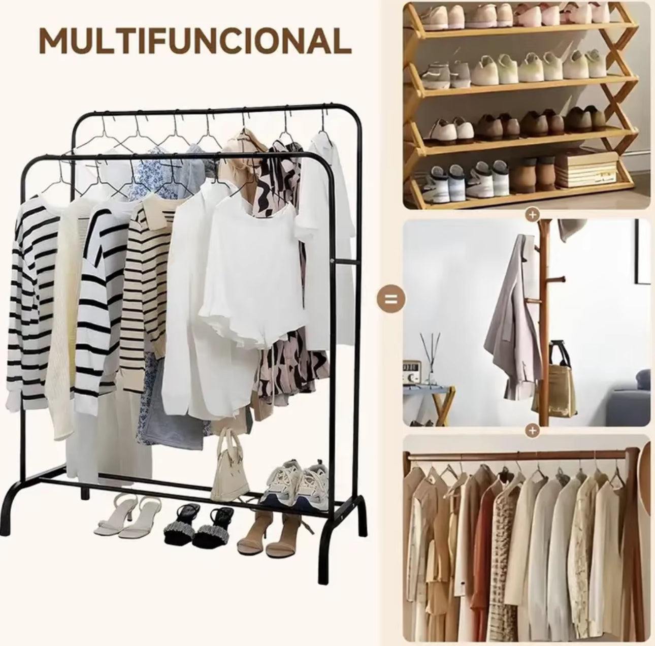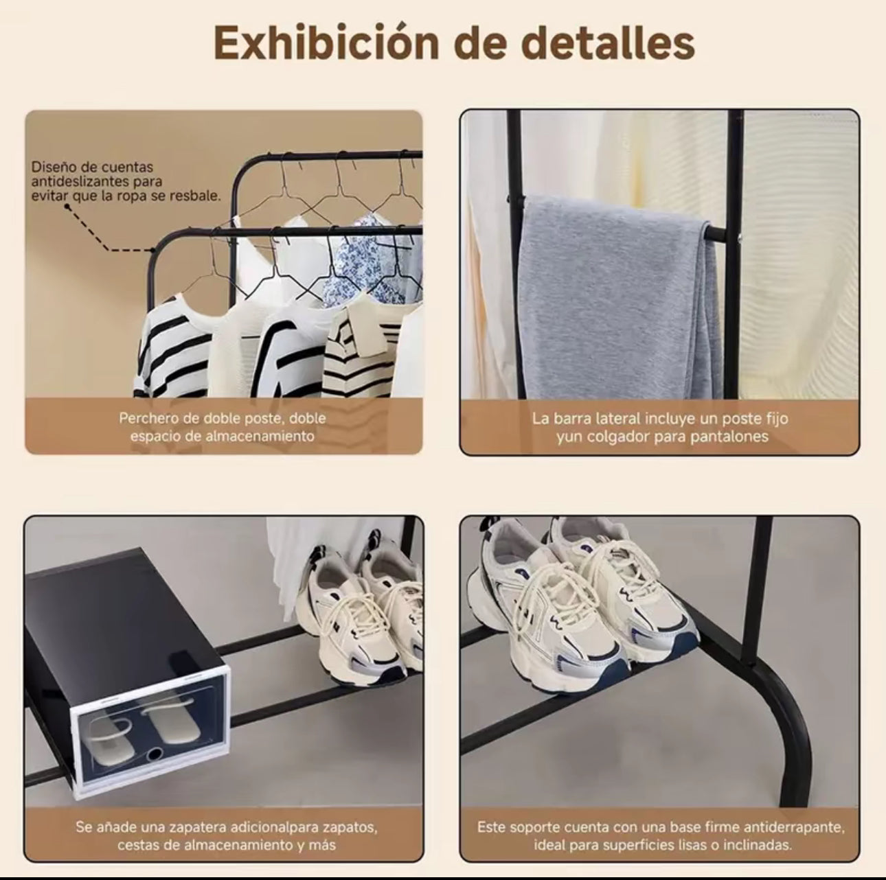 Gran capacidad: El diseño de doble varilla + estante inferior permite secar varias prendas a la vez o guardar zapatos, bolsos y más.