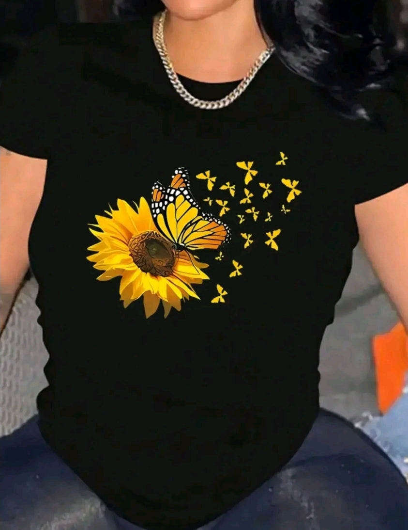 playera para mujer con estampado de Girasol mariposas cuello redondo de poliéster, manga corta, patrónL de alfabeto, camiseta casual de verano para usar en casa