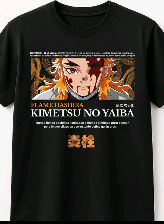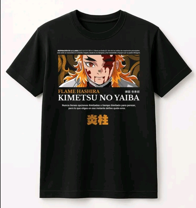 Esta plavera unisex negra Rengoku es perfecta para amantes de! anime. Diseñada con un estampado distintivo combina estilo urbano con streetwear. ldeal para looks casuales y expresar tu pasión por el anime.