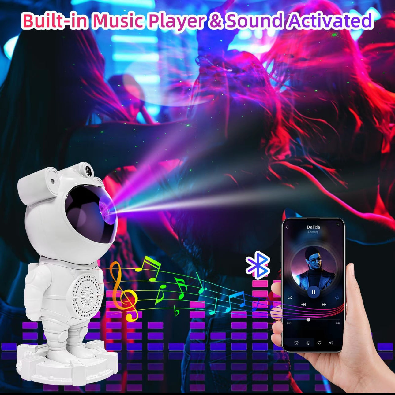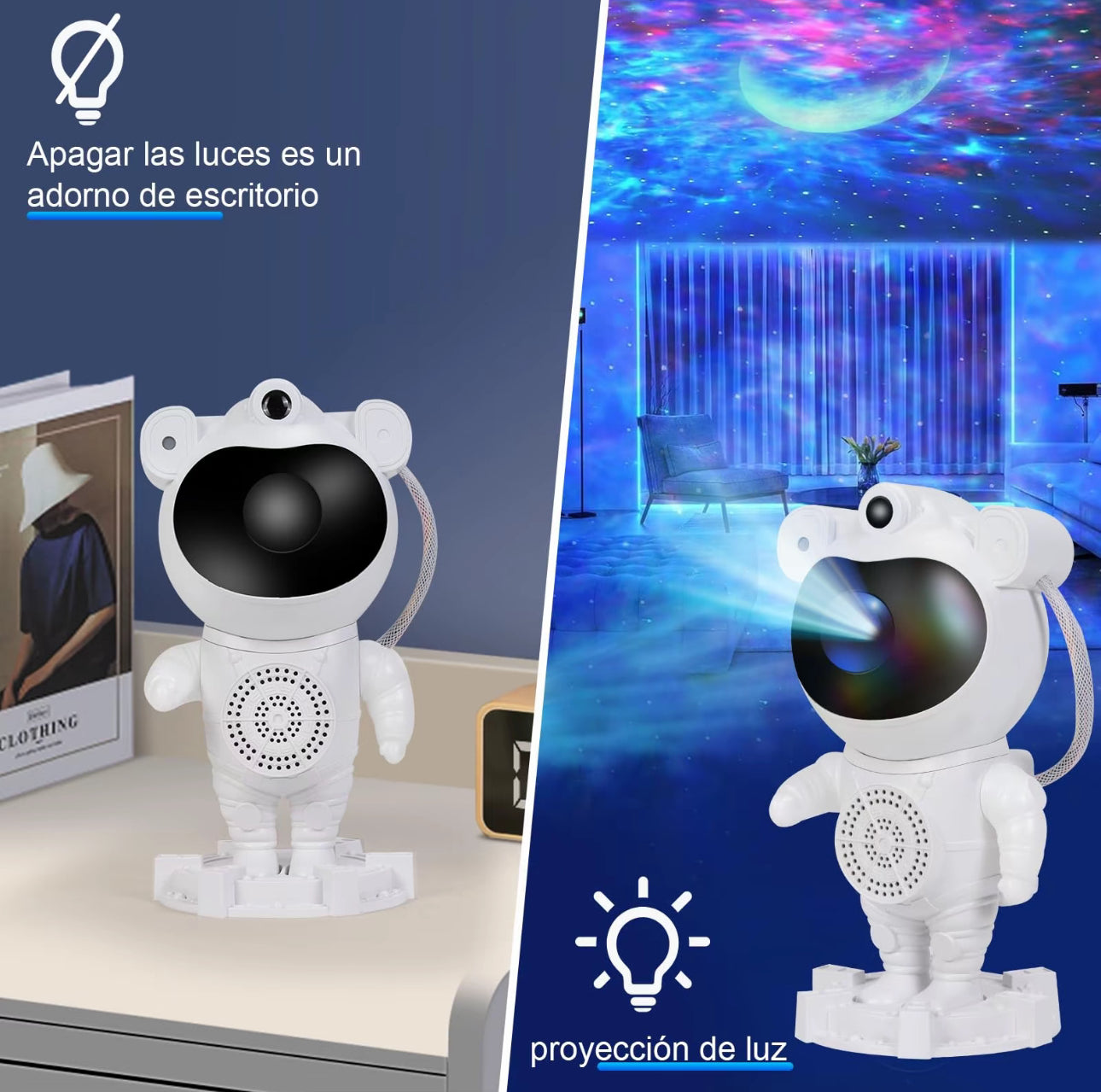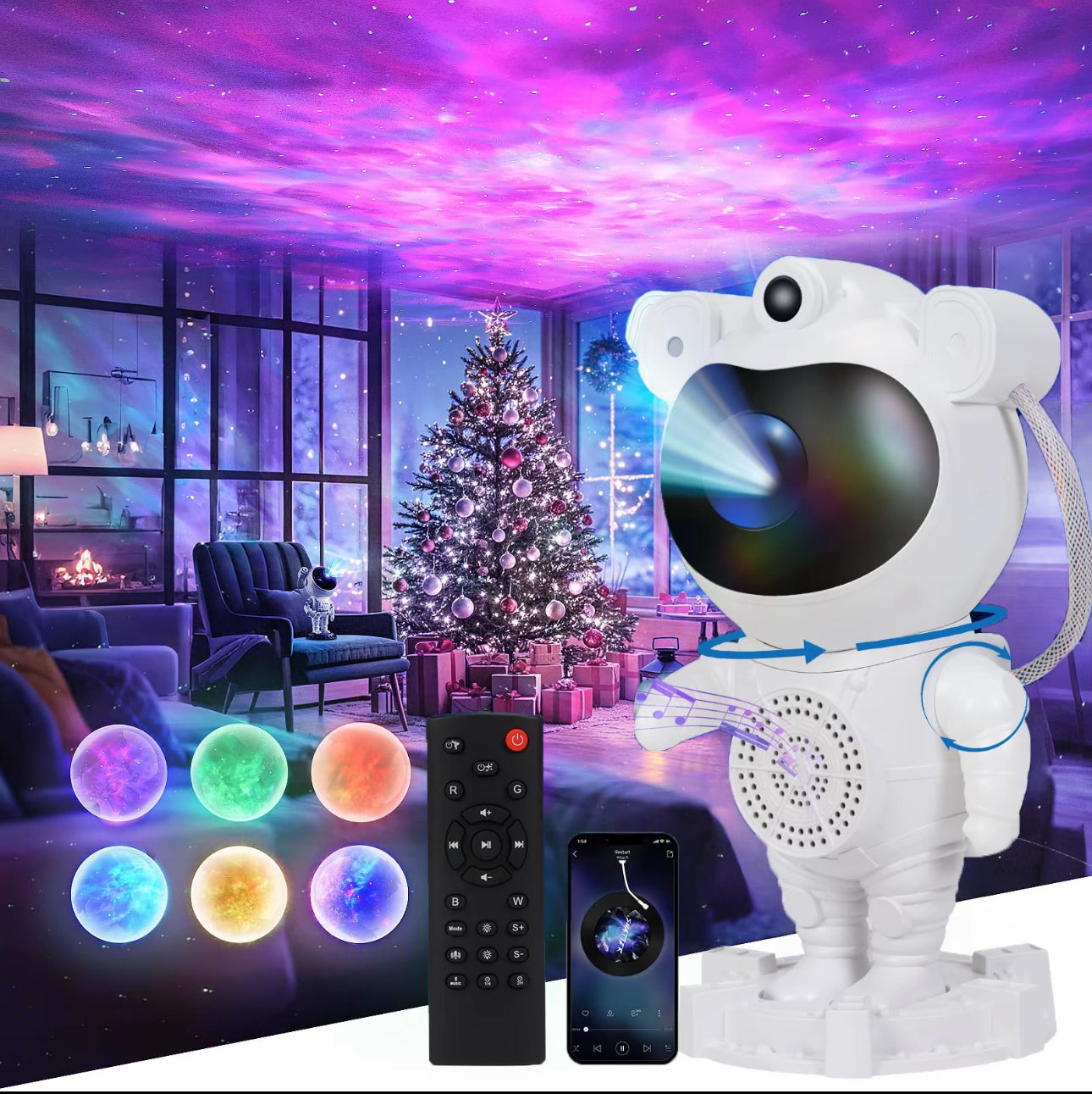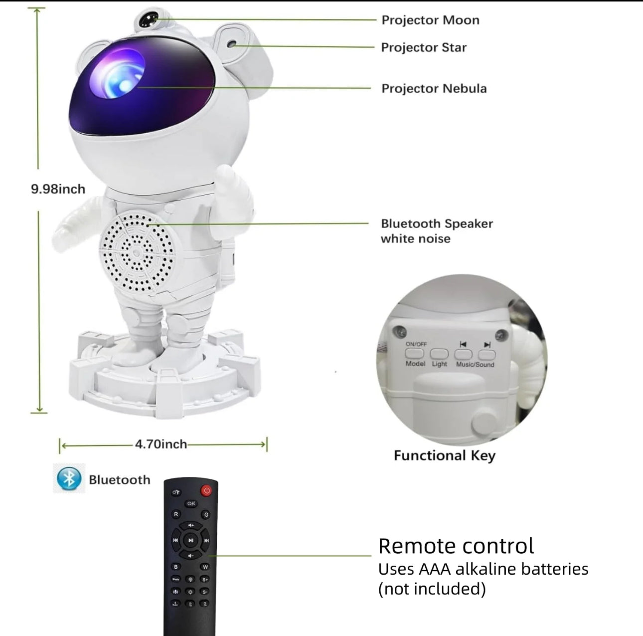 - Nebulosa Astronauta, acompañados de estrellas verdes titilantes. Proyéctalo en las paredes o el techo de tu habitación para llevar la luz de la galaxia a tu espacio, creando un ambiente sereno y relajante. Iluminación ambiental perfecta para noches de cine, noches de cita o configuraciones de juegos.