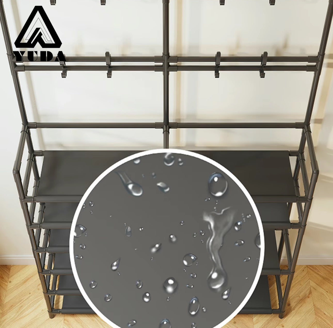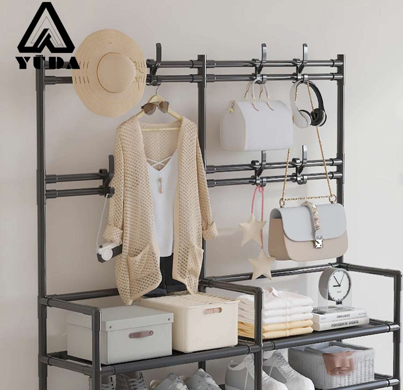 Este zapatero no solo sirve como solución de almacenamiento, sino que también funciona como perchero de pie, lo que lo convierte en un organizador esencial para su colección de artículos para el hogar.
