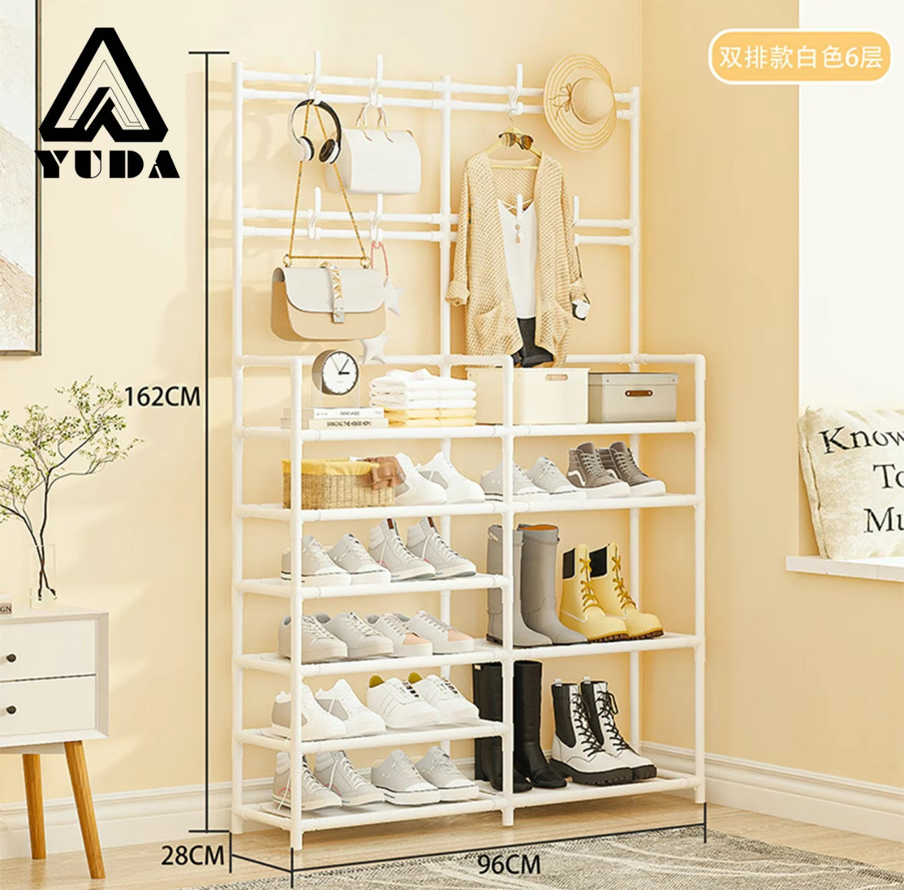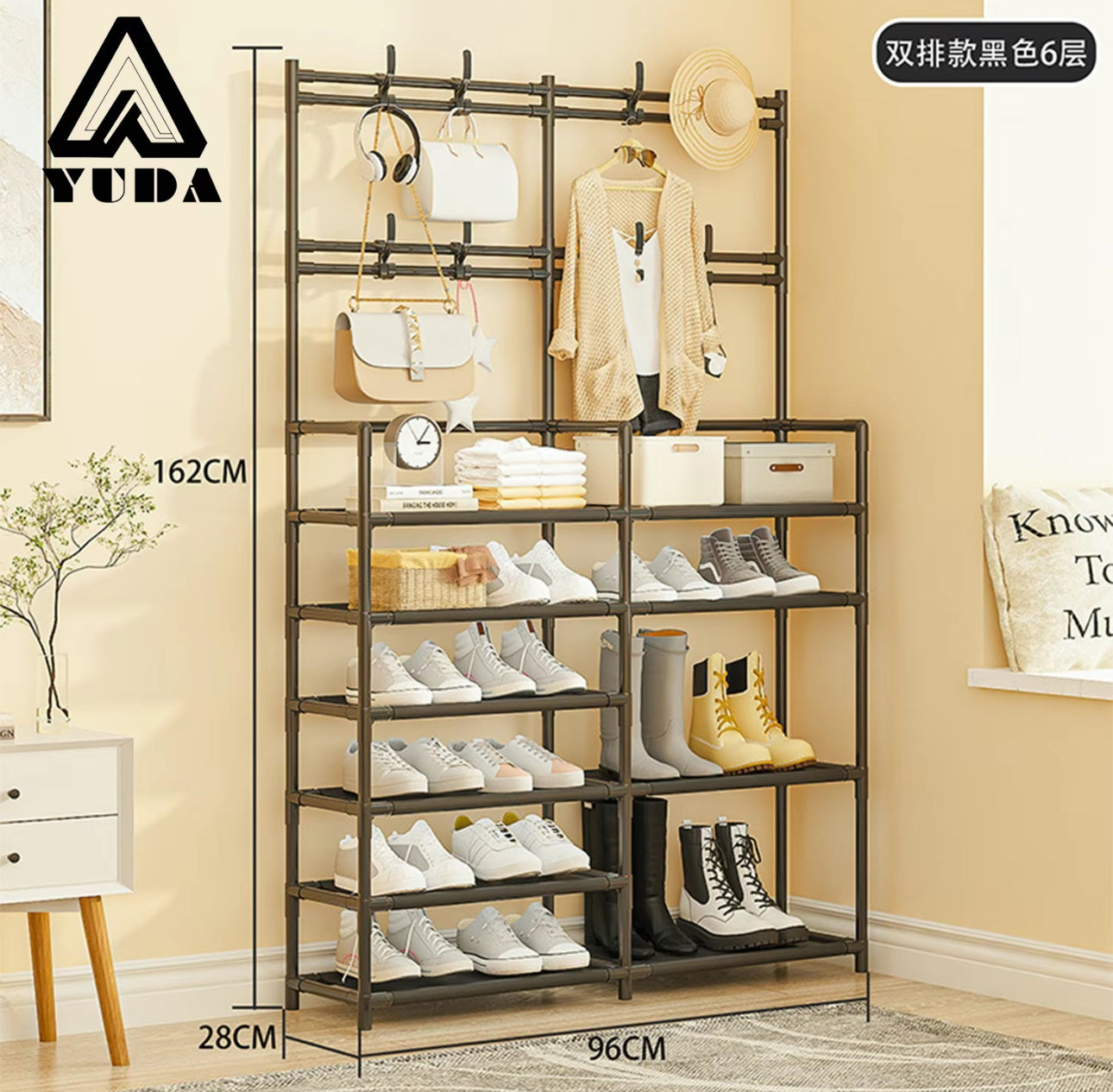Zapatero Multifuncional de 2 Filas y 6 Capas con Perchero de Pie a Prueba de Polvo para Dormitorio y Almacenamiento