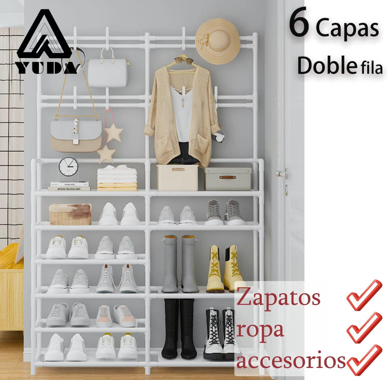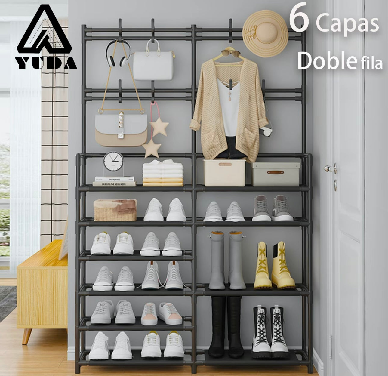 Este zapatero versátil está diseñado para mantener su espacio organizado y sin desorden. Con un amplio diseño de dos filas y seis capas, proporciona un amplio espacio de almacenamiento para zapatos y al mismo tiempo mejora la decoración de la habitación.